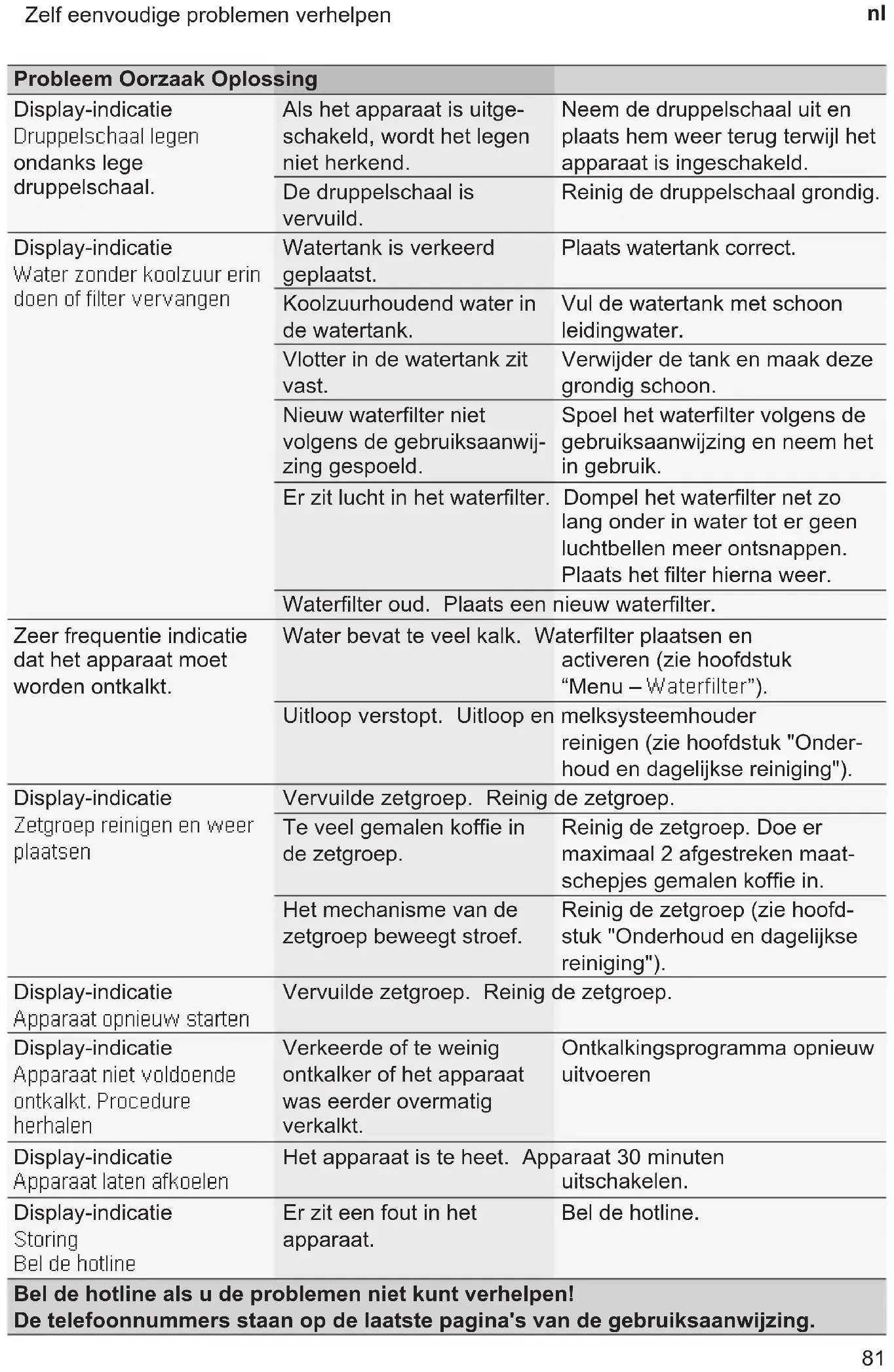 stania z uprawnień z gwarancji prosimy o kontakt z infolinią: 801 191 534 (opłata wg. stawek operatora). Zmiany zastrzeżone. Samodzielne rozwiązywanie prostych problemów Problem Przyczyna Sposób usunięcia Urządzenieprzestało reagować. Usterkaurządzenia Odłączyćwtyczkęodgniazda sieciowego,odczekać 10sekund,ponowniepodłączyć wtyczkędogniazdasieciowego. Niezaczynapracować młynek. Urządzeniejestzagorące. Odłączyćurządzenieodsieci elektrycznejiodczekaćgodzinę, byurządzenieostygło. Znaczneróżnicejakości kawylubspienionego mleka. Urządzeniejest zakamienione. Odkamienićurządzeniezgodnie zinstrukcją. Jeśli problemu nie można rozwiązać, należy koniecznie skontaktować się z info- linią! Numery telefonów znajdują się na ostatnich stronach instrukcji. 105