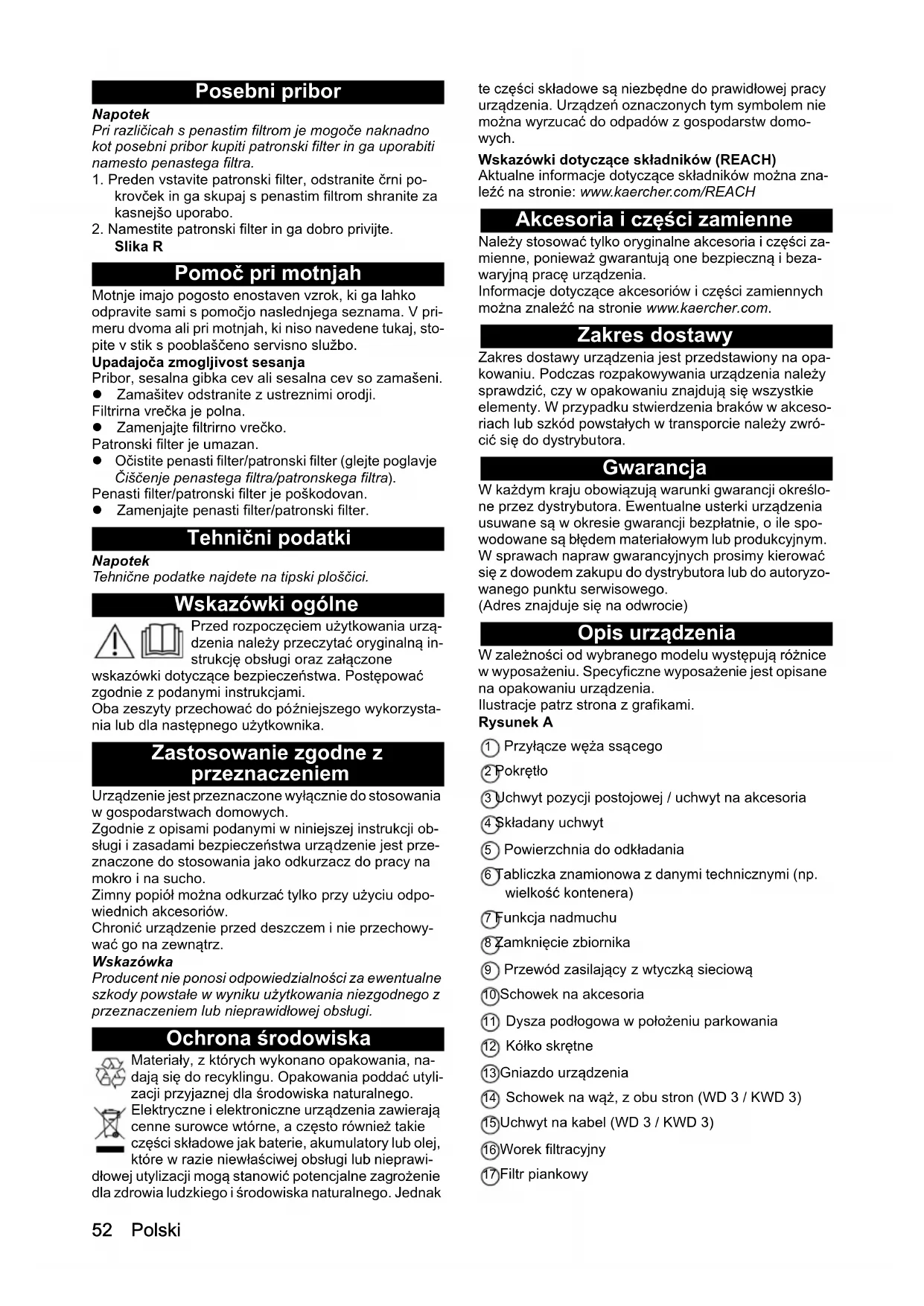 Slika R Pomoč pri motnjah Motnje imajo pogosto enostaven vzrok, ki ga lahko odpravite sami s pomočjo naslednjega seznama. V pri- meru dvoma ali pri motnjah, ki niso navedene tukaj, sto- pite v stik s pooblaščeno servisno službo. Upadajoča zmogljivost sesanja Pribor, sesalna gibka cev ali sesalna cev so zamašeni. Zamašitev odstranite z ustreznimi orodji. Filtrirna vrečka je polna. Zamenjajte filtrirno vrečko. Patronski filter je umazan. Očistite penasti filter/patronski filter (glejte poglavje Čiščenje penastega filtra/patronskega filtra). Penasti filter/patronski filter je poškodovan. Zamenjajte penasti filter/patronski filter. Tehnični podatki Napotek Tehnične podatke najdete na tipski ploščici. Wskazówki ogólne Przed rozpoczęciem użytkowania urzą- dzenia należy przeczytać oryginalną in- strukcję obsługi oraz załączone wskazówki dotyczące bezpieczeństwa. Postępować zgodnie z podanymi instrukcjami. Oba zeszyty przechować do późniejszego wykorzysta- nia lub dla następnego użytkownika. Zastosowanie zgodne z przeznaczeniem Urządzenie jest przeznaczone wyłącznie do stosowania w gospodarstwach domowych. Zgodnie z opisami podanymi w niniejszej instrukcji ob- sługi i zasadami bezpieczeństwa urządzenie jest prze- znaczone do stosowania jako odkurzacz do pracy na mokro i na sucho. Zimny popiół można odkurzać tylko przy użyciu odpo- wiednich akcesoriów. Chronić urządzenie przed deszczem i nie przechowy- wać go na zewnątrz. Wskazówka Producent nie ponosi odpowiedzialności za ewentualne szkody powstałe w wyniku użytkowania niezgodnego z przeznaczeniem lub nieprawidłowej obsługi. Ochrona środowiska Materiały, z których wykonano opakowania, na- dają się do recyklingu. Opakowania poddać utyli- zacji przyjaznej dla środowiska naturalnego. Elektryczne i elektroniczne urządzenia zawierają cenne surowce wtórne, a często również takie części składowe jak baterie, akumulatory lub olej, które w razie niewłaściwej obsługi lub nieprawi- dłowej utylizacji mogą stanowić potencjalne zagrożenie dla zdrowia ludzkiego i środowiska naturalnego. Jednak te części składowe są niezbędne do prawidłowej pracy urządzenia. Urządzeń oznaczonych tym symbolem nie można wyrzucać do odpadów z gospodarstw domo- wych. Wskazówki dotyczące składników (REACH) Aktualne informacje dotyczące składników można zna- leźć na stronie: www.kaercher.com/REACH Akcesoria i części zamienne Należy stosować tylko oryginalne akcesoria i części za- mienne, ponieważ gwarantują one bezpieczną i beza- waryjną pracę urządzenia. Informacje dotyczące akcesoriów i części zamiennych można znaleźć na stronie www.kaercher.com. Zakres dostawy Zakres dostawy urządzenia jest przedstawiony na opa- kowaniu. Podczas rozpakowywania urządzenia należy sprawdzić, czy w opakowaniu znajdują się wszystkie elementy. W przypadku stwierdzenia braków w akceso- riach lub szkód powstałych w transporcie należy zwró- cić się do dystrybutora. Gwarancja W każdym kraju obowiązują warunki gwarancji określo- ne przez dystrybutora. Ewentualne usterki urządzenia usuwane są w okresie gwarancji bezpłatnie, o ile spo- wodowane są błędem materiałowym lub produkcyjnym. W sprawach napraw gwarancyjnych prosimy kierować się z dowodem zakupu do dystrybutora lub do autoryzo- wanego punktu serwisowego. (Adres znajduje się na odwrocie) Opis urządzenia W zależności od wybranego modelu występują różnice w wyposażeniu. Specyficzne wyposażenie jest opisane na opakowaniu urządzenia. Ilustracje patrz strona z grafikami. Rysunek A 1 Przyłącze węża ssącego 2 Pokrętło 3 Uchwyt pozycji postojowej / uchwyt na akcesoria 4 Składany uchwyt 5 Powierzchnia do odkładania 6 Tabliczka znamionowa z danymi technicznymi (np. wielkość kontenera) 7 Funkcja nadmuchu 8 Zamknięcie zbiornika 9 Przewód zasilający z wtyczką sieciową 10 Schowek na akcesoria 11 Dysza podłogowa w położeniu parkowania 12 Kółko skrętne 13 Gniazdo urządzenia 14 Schowek na wąż, z obu stron (WD 3 / KWD 3) 15 Uchwyt na kabel (WD 3 / KWD 3) 16 Worek filtracyjny 17 Filtr piankowyPolski 53 18 Wkład filtracyjny 19 Wąż ssący (WD 2 Plus / KWD 2) 20 Zdejmowany uchwyt (WD 3 / KWD 3) 21 Wąż ssący ze złączką (WD 3 / KWD 3) 22 Rury ssące 2 x 0,5 m 23 Dysza do fug 24 Dysza podłogowa 25 Adapter do podłączenia elektronarzędzi Montaż kółek skrętnych