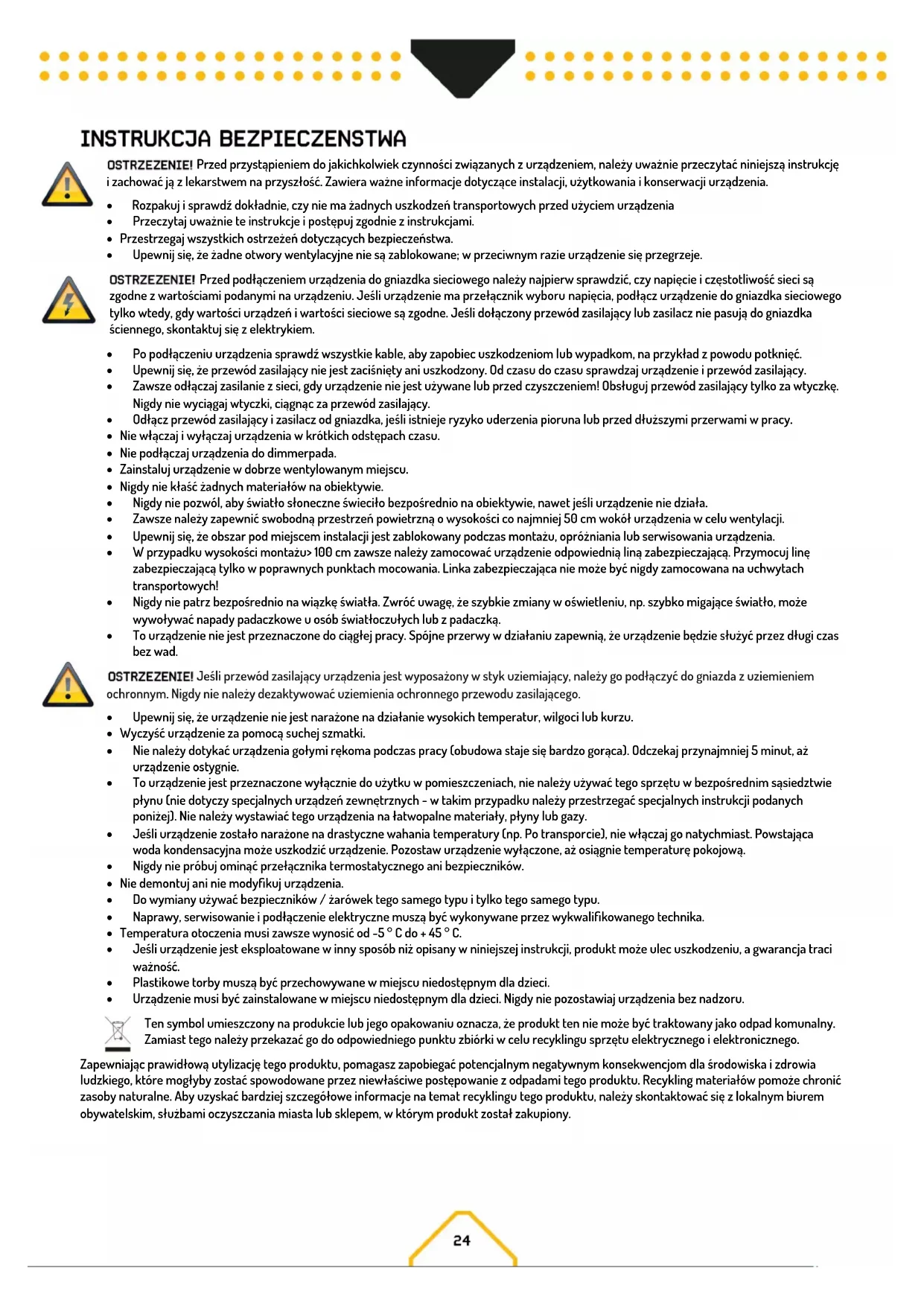 Vérifiez la version du logiciel de l'appareil et les messages d'erreur pour plus d'informations. Contacter le service après- vente Beamz ou un partenaire de service agréé Beamz. Le flux lumineux coupe de manière intermittente. L’appareil est trop chaud. Laisser refroidir l'appareil. Réduire la température ambiante. Veillez à ce que l'air circule librement autour de l'appareil. Nettoyer l'appareil si nécessaire. Les LEDs sont endommagées. Débrancher l'appareil et contacter le service après-vente Beamz ou un partenaire agréé Beamz.. Les réglages de l’alimentation ne correspondent pas à la tension AC et à la fréquence locales. Débranchez l’appareil. Vérifiez les réglages et corrigez si besoin.Przed przystąpieniem do jakichkolwiek czynności związanych z urządzeniem, należy uważnie przeczytać niniejszą instrukcję i zachować ją z lekarstwem na przyszłość. Zawiera ważne informacje dotyczące instalacji, użytkowania i konserwacji urządzenia. Rozpakuj i sprawdź dokładnie, czy nie ma żadnych uszkodzeń transportowych przed użyciem urządzenia Przeczytaj uważnie te instrukcje i postępuj zgodnie z instrukcjami. Przestrzegaj wszystkich ostrzeżeń dotyczących bezpieczeństwa. Upewnij się, że żadne otwory wentylacyjne nie są zablokowane; w przeciwnym razie urządzenie się przegrzeje. Przed podłączeniem urządzenia do gniazdka sieciowego należy najpierw sprawdzić, czy napięcie i częstotliwość sieci są zgodne z wartościami podanymi na urządzeniu. Jeśli urządzenie ma przełącznik wyboru napięcia, podłącz urządzenie do gniazdka sieciowego tylko wtedy, gdy wartości urządzeń i wartości sieciowe są zgodne. Jeśli dołączony przewód zasilający lub zasilacz nie pasują do gniazdka ściennego, skontaktuj się z elektrykiem. Po podłączeniu urządzenia sprawdź wszystkie kable, aby zapobiec uszkodzeniom lub wypadkom, na przykład z powodu potknięć. Upewnij się, że przewód zasilający nie jest zaciśnięty ani uszkodzony. Od czasu do czasu sprawdzaj urządzenie i przewód zasilający. Zawsze odłączaj zasilanie z sieci, gdy urządzenie nie jest używane lub przed czyszczeniem! Obsługuj przewód zasilający tylko za wtyczkę. Nigdy nie wyciągaj wtyczki, ciągnąc za przewód zasilający. Odłącz przewód zasilający i zasilacz od gniazdka, jeśli istnieje ryzyko uderzenia pioruna lub przed dłuższymi przerwami w pracy. Nie włączaj i wyłączaj urządzenia w krótkich odstępach czasu. Nie podłączaj urządzenia do dimmerpada. Zainstaluj urządzenie w dobrze wentylowanym miejscu. Nigdy nie kłaść żadnych materiałów na obiektywie. Nigdy nie pozwól, aby światło słoneczne świeciło bezpośrednio na obiektywie, nawet jeśli urządzenie nie działa. Zawsze należy zapewnić swobodną przestrzeń powietrzną o wysokości co najmniej 50 cm wokół urządzenia w celu wentylacji. Upewnij się, że obszar pod miejscem instalacji jest zablokowany podczas montażu, opróżniania lub serwisowania urządzenia. W przypadku wysokości montażu> 100 cm zawsze należy zamocować urządzenie odpowiednią liną zabezpieczającą. Przymocuj linę zabezpieczającą tylko w poprawnych punktach mocowania. Linka zabezpieczająca nie może być nigdy zamocowana na uchwytach transportowych! Nigdy nie patrz bezpośrednio na wiązkę światła. Zwróć uwagę, że szybkie zmiany w oświetleniu, np. szybko migające światło, może wywoływać napady padaczkowe u osób światłoczułych lub z padaczką. To urządzenie nie jest przeznaczone do ciągłej pracy. Spójne przerwy w działaniu zapewnią, że urządzenie będzie służyć przez długi czas bez wad. Jeśli przewód zasilający urządzenia jest wyposażony w styk uziemiający, należy go podłączyć do gniazda z uziemieniem ochronnym. Nigdy nie należy dezaktywować uziemienia ochronnego przewodu zasilającego. Upewnij się, że urządzenie nie jest narażone na działanie wysokich temperatur, wilgoci lub kurzu. Wyczyść urządzenie za pomocą suchej szmatki. Nie należy dotykać urządzenia gołymi rękoma podczas pracy (obudowa staje się bardzo gorąca). Odczekaj przynajmniej 5 minut, aż urządzenie ostygnie. To urządzenie jest przeznaczone wyłącznie do użytku w pomieszczeniach, nie należy używać tego sprzętu w bezpośrednim sąsiedztwie płynu (nie dotyczy specjalnych urządzeń zewnętrznych - w takim przypadku należy przestrzegać specjalnych instrukcji podanych poniżej). Nie należy wystawiać tego urządzenia na łatwopalne materiały, płyny lub gazy. Jeśli urządzenie zostało narażone na drastyczne wahania temperatury (np. Po transporcie), nie włączaj go natychmiast. Powstająca woda kondensacyjna może uszkodzić urządzenie. Pozostaw urządzenie wyłączone, aż osiągnie temperaturę pokojową. Nigdy nie próbuj ominąć przełącznika termostatycznego ani bezpieczników. Nie demontuj ani nie modyfikuj urządzenia. Do wymiany używać bezpieczników / żarówek tego samego typu i tylko tego samego typu. Naprawy, serwisowanie i podłączenie elektryczne muszą być wykonywane przez wykwalifikowanego technika. Temperatura otoczenia musi zawsze wynosić od -5 ° C do + 45 ° C. Jeśli urządzenie jest eksploatowane w inny sposób niż opisany w niniejszej instrukcji, produkt może ulec uszkodzeniu, a gwarancja traci ważność. Plastikowe torby muszą być przechowywane w miejscu niedostępnym dla dzieci. Urządzenie musi być zainstalowane w miejscu niedostępnym dla dzieci. Nigdy nie pozostawiaj urządzenia bez nadzoru. Ten symbol umieszczony na produkcie lub jego opakowaniu oznacza, że produkt ten nie może być traktowany jako odpad komunalny. Zamiast tego należy przekazać go do odpowiedniego punktu zbiórki w celu recyklingu sprzętu elektrycznego i elektronicznego. Zapewniając prawidłową utylizację tego produktu, pomagasz zapobiegać potencjalnym negatywnym konsekwencjom dla środowiska i zdrowia ludzkiego, które mogłyby zostać spowodowan