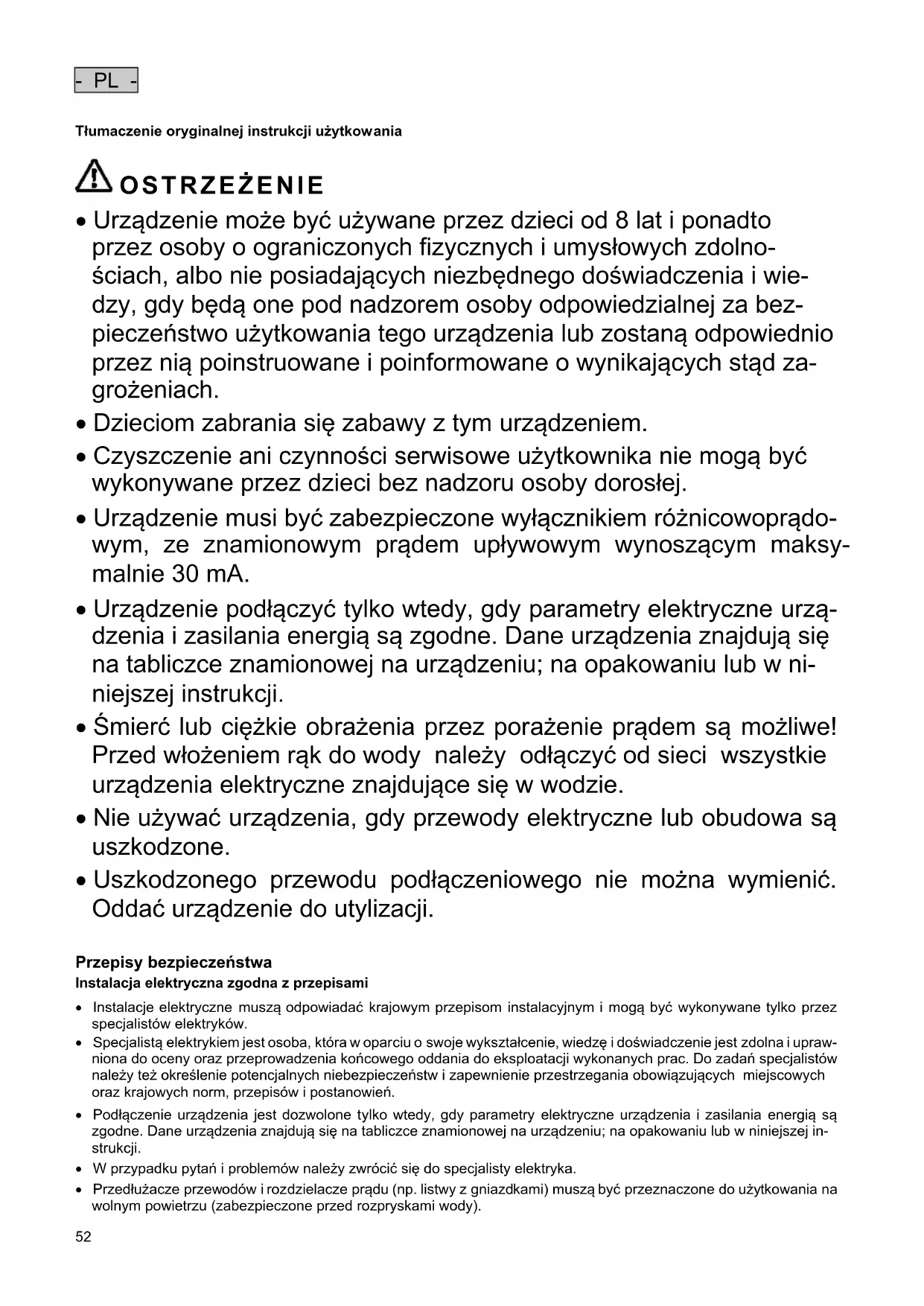 - Przed włożeniem rąk do wody należy odłączyć napięcie sieciowe wszystkich znajdujących się w wodzie urządzeń.