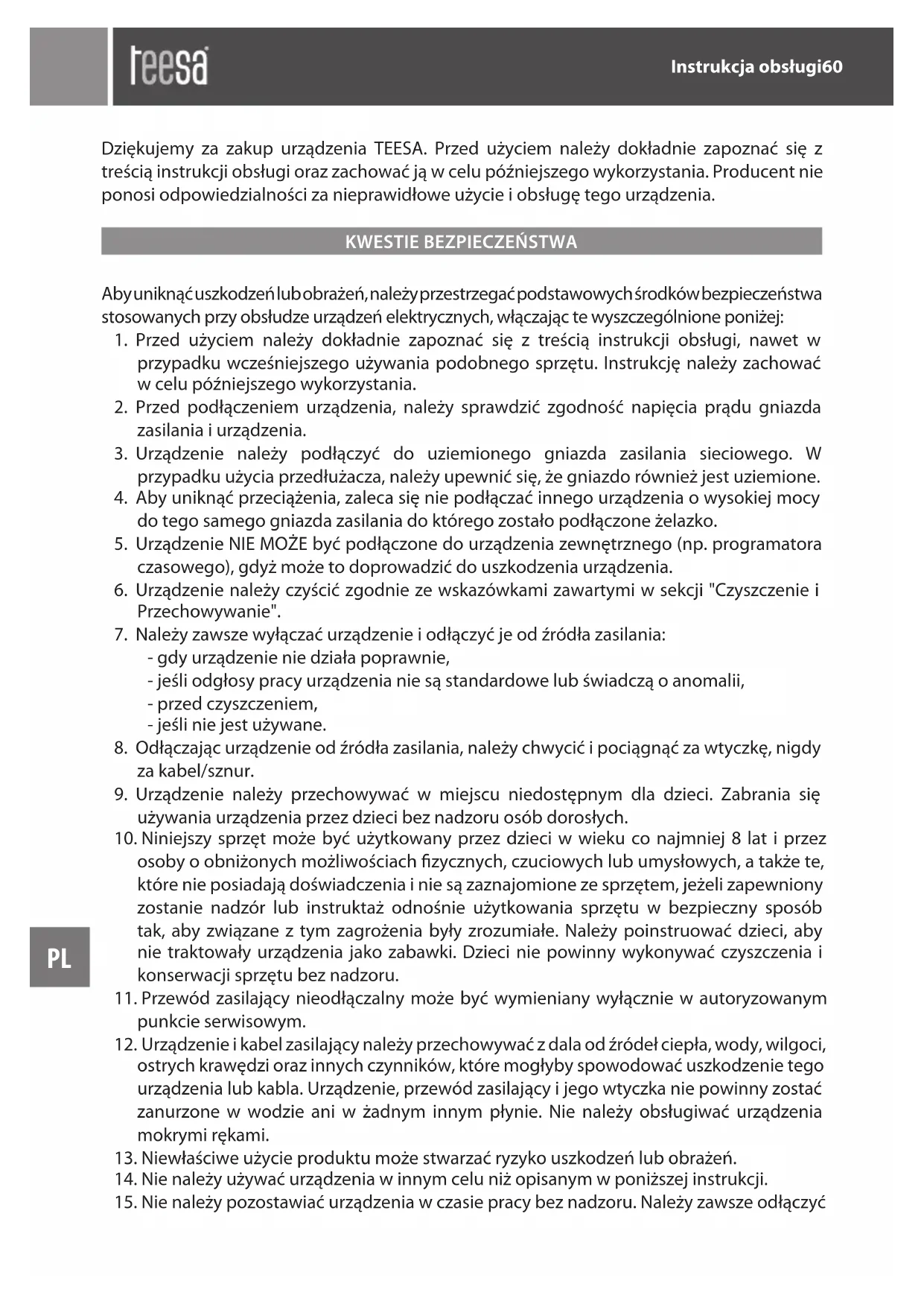 - De set bevat: strijkijzer, bakje om water te schenkenPL Instrukcja obsługi60 Dziękujemy za zakup urządzenia TEESA. Przed użyciem należy dokładnie zapoznać się z treścią instrukcji obsługi oraz zachować ją w celu późniejszego wykorzystania. Producent nie ponosi odpowiedzialności za nieprawidłowe użycie i obsługę tego urządzenia.