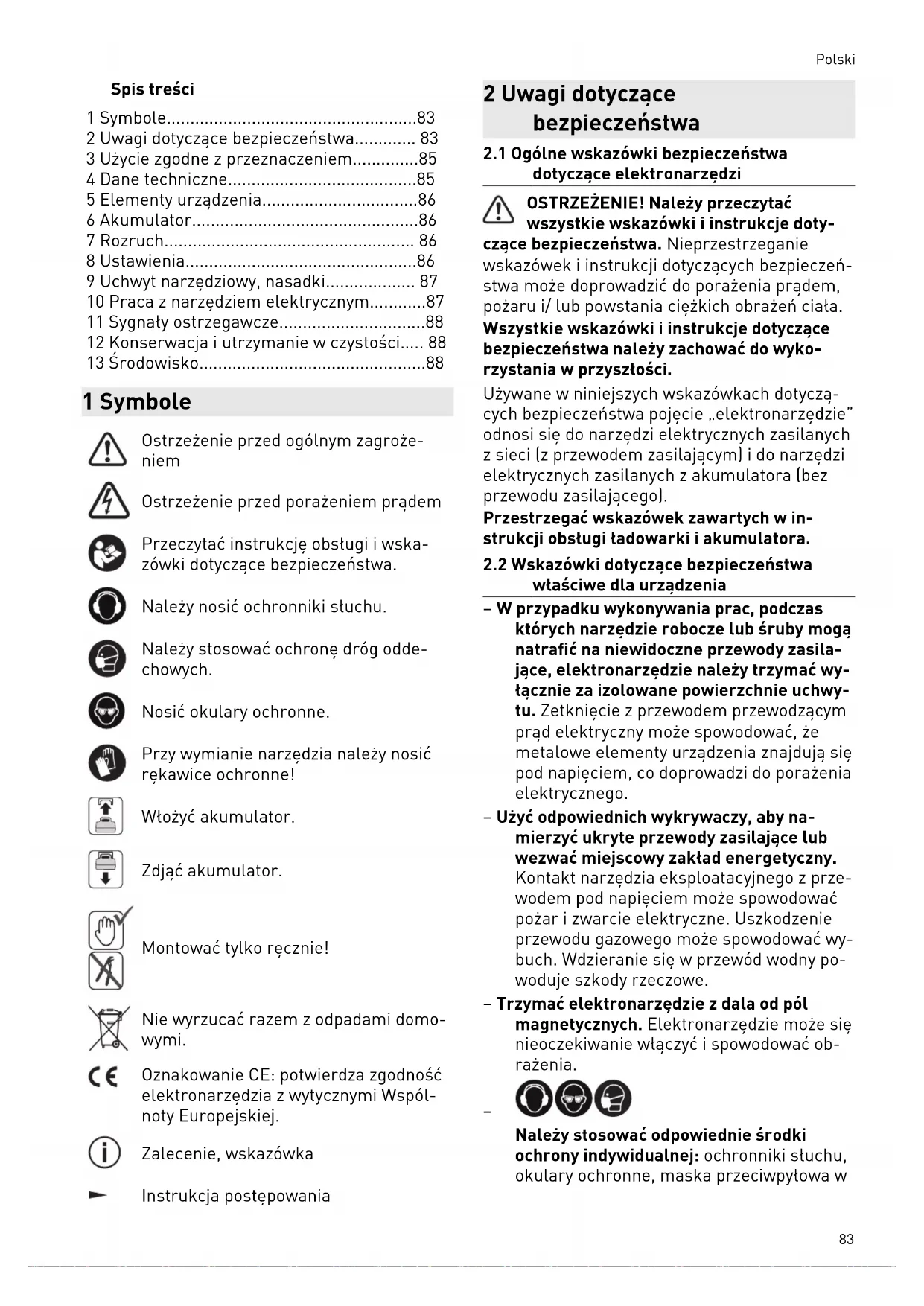 - 13 Środowisko 1 Symbole Ostrzeżenie przed ogólnym zagroże niem Ostrzeżenie przed porażeniem prądem Przeczytać instrukcję obsługi i wska zówki dotyczące bezpieczeństwa. Należy nosić ochronniki słuchu. Należy stosować ochronę dróg odde chowych. Nosić okulary ochronne. Przy wymianie narzędzia należy nosić rękawice ochronne! Włożyć akumulator. Zdjąć akumulator. Montować tylko ręcznie! Nie wyrzucać razem z odpadami domo wymi. Oznakowanie CE: potwierdza zgodność elektronarzędzia z wytycznymi Wspól noty Europejskiej. Zalecenie, wskazówka Instrukcja postępowania 2 Uwagi dotyczące bezpieczeństwa p. 88