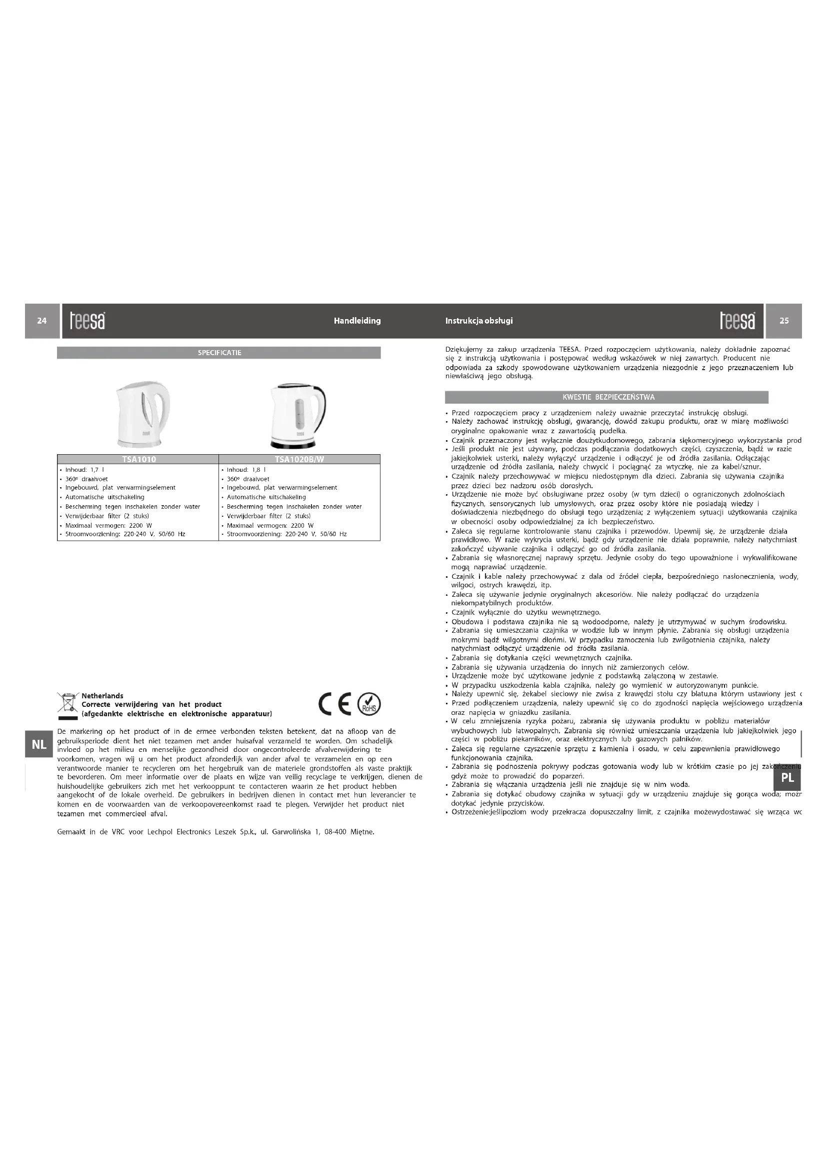 - in hotels (door de gasten) WAARSCHUWINGEN Handleiding Handleiding22 23 NLNLDziękujemy za zakup urządzenia TEESA. Przed rozpoczęciem użytkowania, należy dokładnie zapoznać się z instrukcją użytkowania i postępować według wskazówek w niej zawartych. Producent nie odpowiada za szkody spowodowane użytkowaniem urządzenia niezgodnie z jego przeznaczeniem lub niewłaściwą jego obsługą.