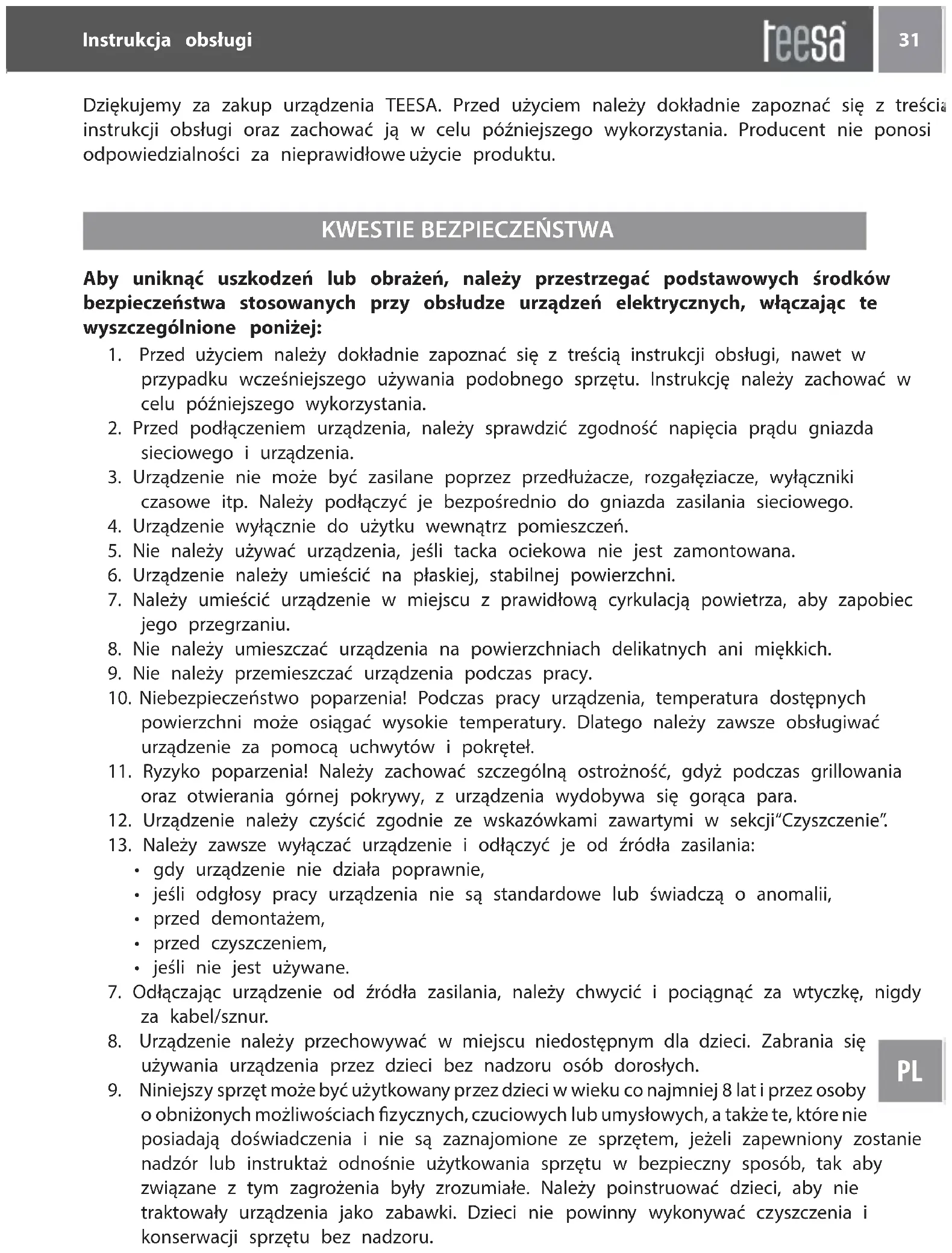o obniżonych możliwościach zycznych, czuciowych lub umysłowych, a także te, które nie posiadają doświadczenia i nie są zaznajomione ze sprzętem, jeżeli zapewniony zostanie nadzór lub instruktaż odnośnie użytkowania sprzętu w bezpieczny sposób, tak aby związane z tym zagrożenia były zrozumiałe. Należy poinstruować dzieci, aby nie traktowały urządzenia jako zabawki. Dzieci nie powinny wykonywać czyszczenia i konserwacji sprzętu bez nadzoru. Dziękujemy za zakup urządzenia TEESA. Przed użyciem należy dokładnie zapoznać się z treścią instrukcji obsługi oraz zachować ją w celu późniejszego wykorzystania. Producent nie ponosi odpowiedzialności za nieprawidłowe użycie produktu. 31Gebruiksaanwijzing