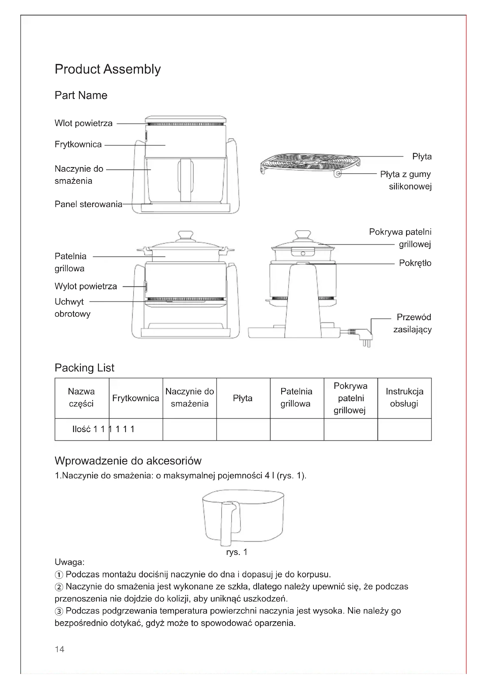 20.Nie należy przenosić urządzenia podczas jego pracy. 21.Podczas przenoszenia urządzenia należy trzymać naczynie i patelnię grillową, aby zapobiec ich upadkowi, obrażeniom ciała lub uszkodzeniu.23