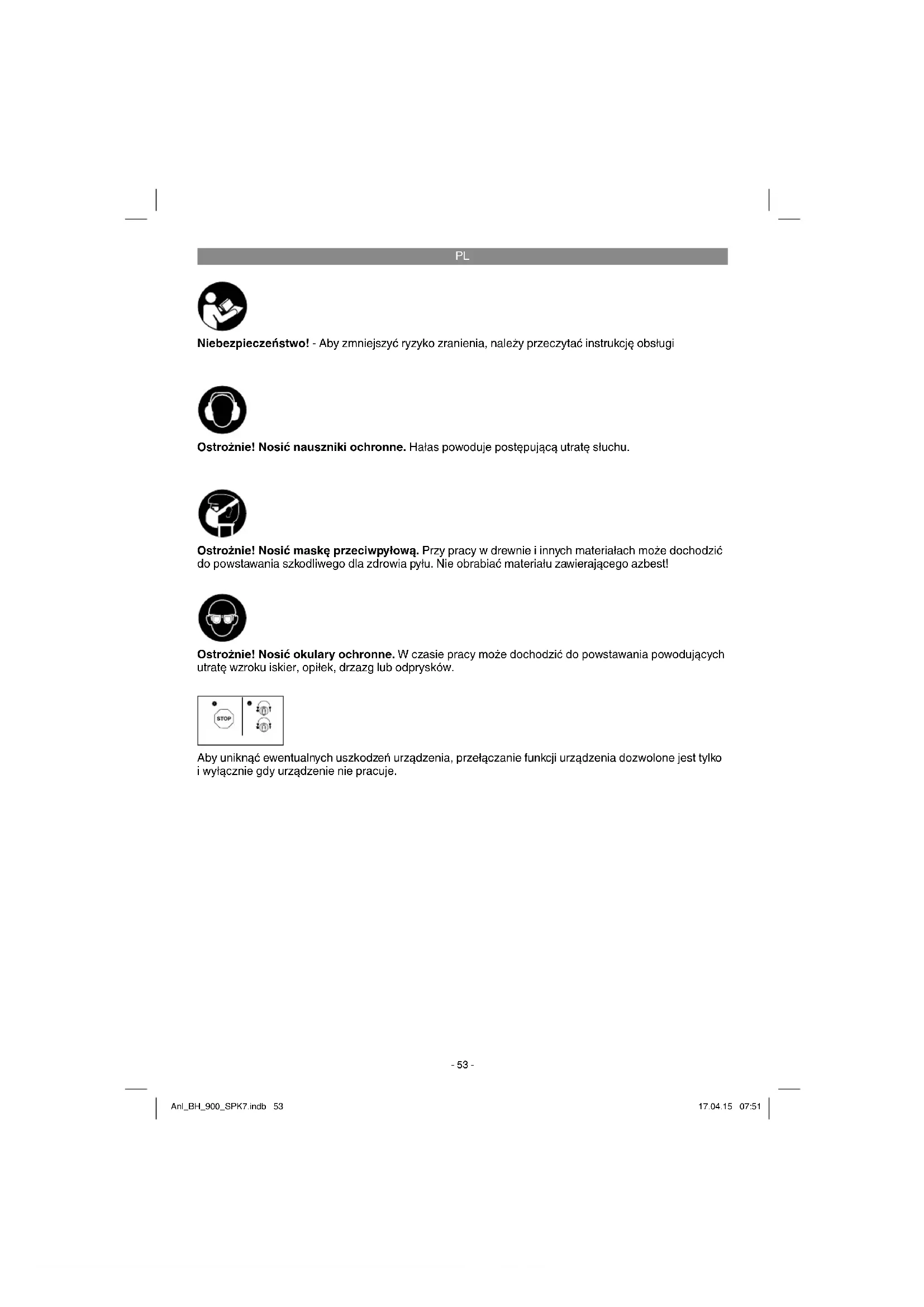Niebezpieczeństwo! - Aby zmniejszyć ryzyko zranienia, należy przeczytać instrukcję obsługi Ostrożnie! Nosić nauszniki ochronne. Hałas powoduje postępującą utratę słuchu. Ostrożnie! Nosić okulary ochronne. W czasie pracy może dochodzić do powstawania powodujących utratę wzroku iskier, opiłek, drzazg lub odprysków. Ostrożnie! Nosić maskę przeciwpyłową. Przy pracy w drewnie i innych materiałach może dochodzić do powstawania szkodliwego dla zdrowia pyłu. Nie obrabiać materiału zawierającego azbest! Aby uniknąć ewentualnych uszkodzeń urządzenia, przełączanie funkcji urządzenia dozwolone jest tylko i wyłącznie gdy urządzenie nie pracuje. Anl_BH_900_SPK7.indb 53Anl_BH_900_SPK7.indb 53 17.04.15 07:5117.04.15 07:51PL
