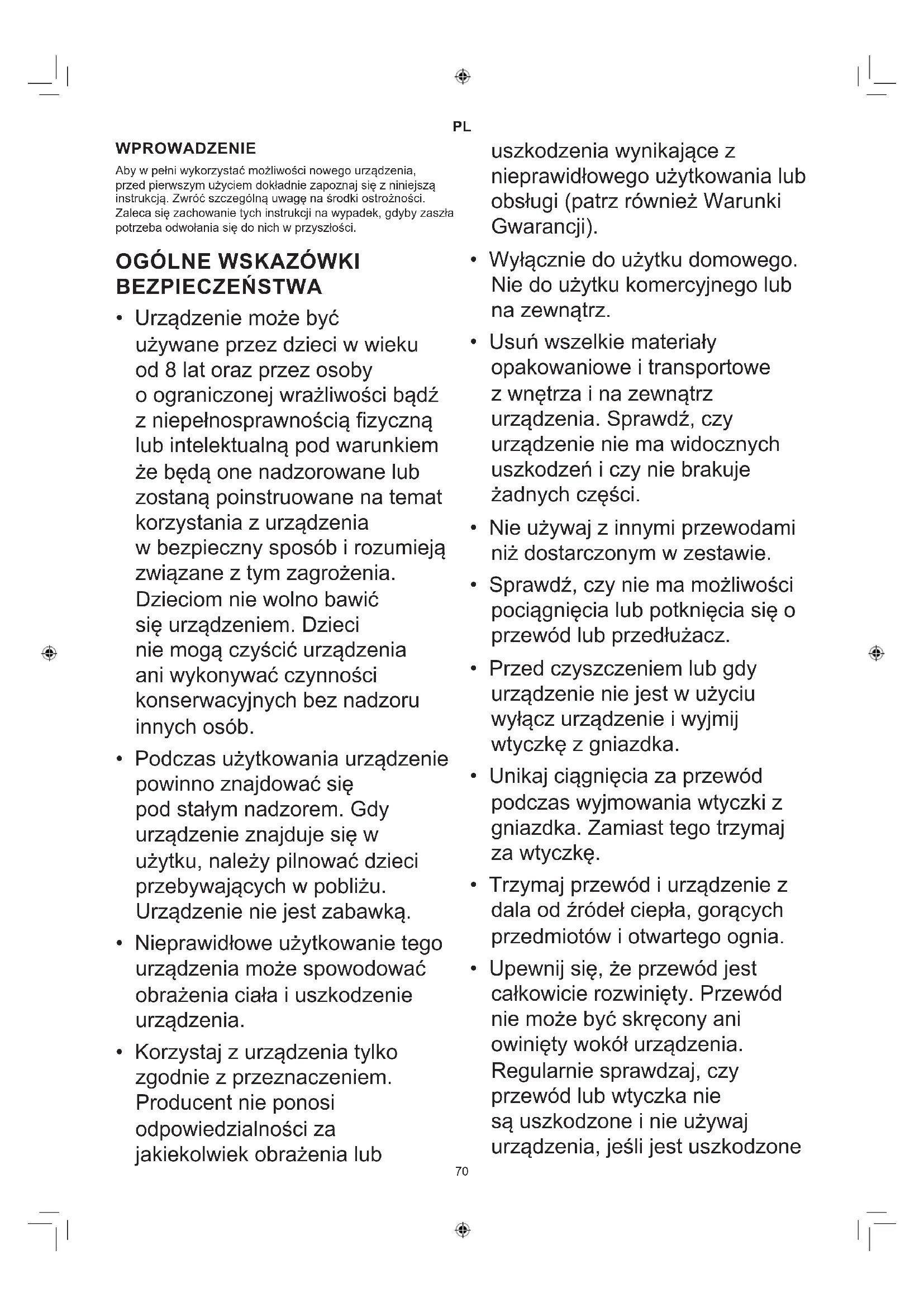 - Upewnij się, że przewód jest całkowicie rozwinięty. Przewód nie może być skręcony ani owinięty wokół urządzenia. Regularnie sprawdzaj, czy przewód lub wtyczka nie są uszkodzone i nie używaj urządzenia, jeśli jest uszkodzone71