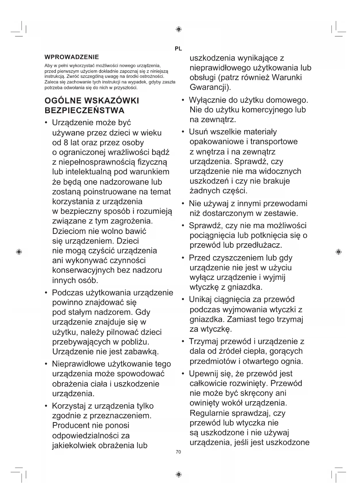 - Upewnij się, że przewód jest całkowicie rozwinięty. Przewód nie może być skręcony ani owinięty wokół urządzenia. Regularnie sprawdzaj, czy przewód lub wtyczka nie są uszkodzone i nie używaj urządzenia, jeśli jest uszkodzone71