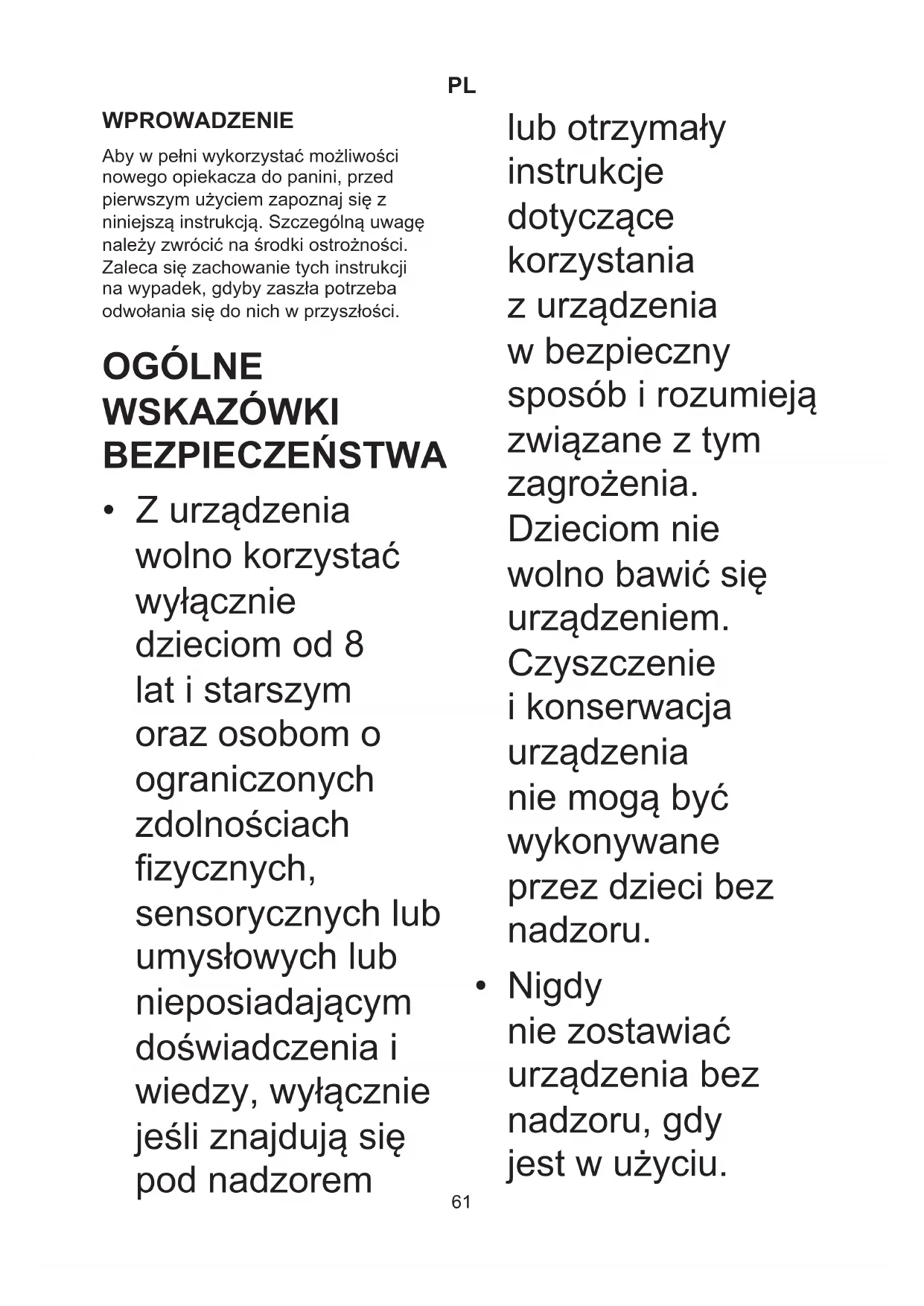 WPROWADZENIE Aby w pełni wykorzystać możliwości nowego opiekacza do panini, przed pierwszym użyciem zapoznaj się z niniejszą instrukcją. Szczególną uwagę należy zwrócić na środki ostrożności. Zaleca się zachowanie tych instrukcji na wypadek, gdyby zaszła potrzeba odwołania się do nich w przyszłości. OGÓLNE WSKAZÓWKI BEZPIECZEŃSTWA