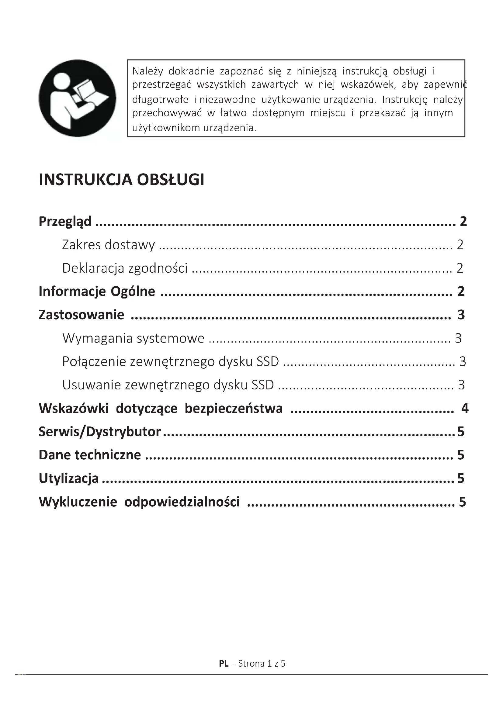 - Wykluczenie odpowiedzialności PL - Strona 1 z 5PL - Strona 1 z 5 PRZEGLĄD Zakres dostawy Proszę sprawdzić, czy zawartość opakowania (patrz również rysunek na początku instrukcji na stronie 2) jest kompletna i nieuszkodzona. W przeciwnym razie prosimy o kontakt ze sprzedawcą lub naszym działem obsługi: rma@intenso-internaonal.de Deklaracja zgodności znaczenie CE potwierdza, że ten wyrób spełnia wymagania wszystkich obowiązujących dla tego wyrobu dyrektyw UE. p. 5