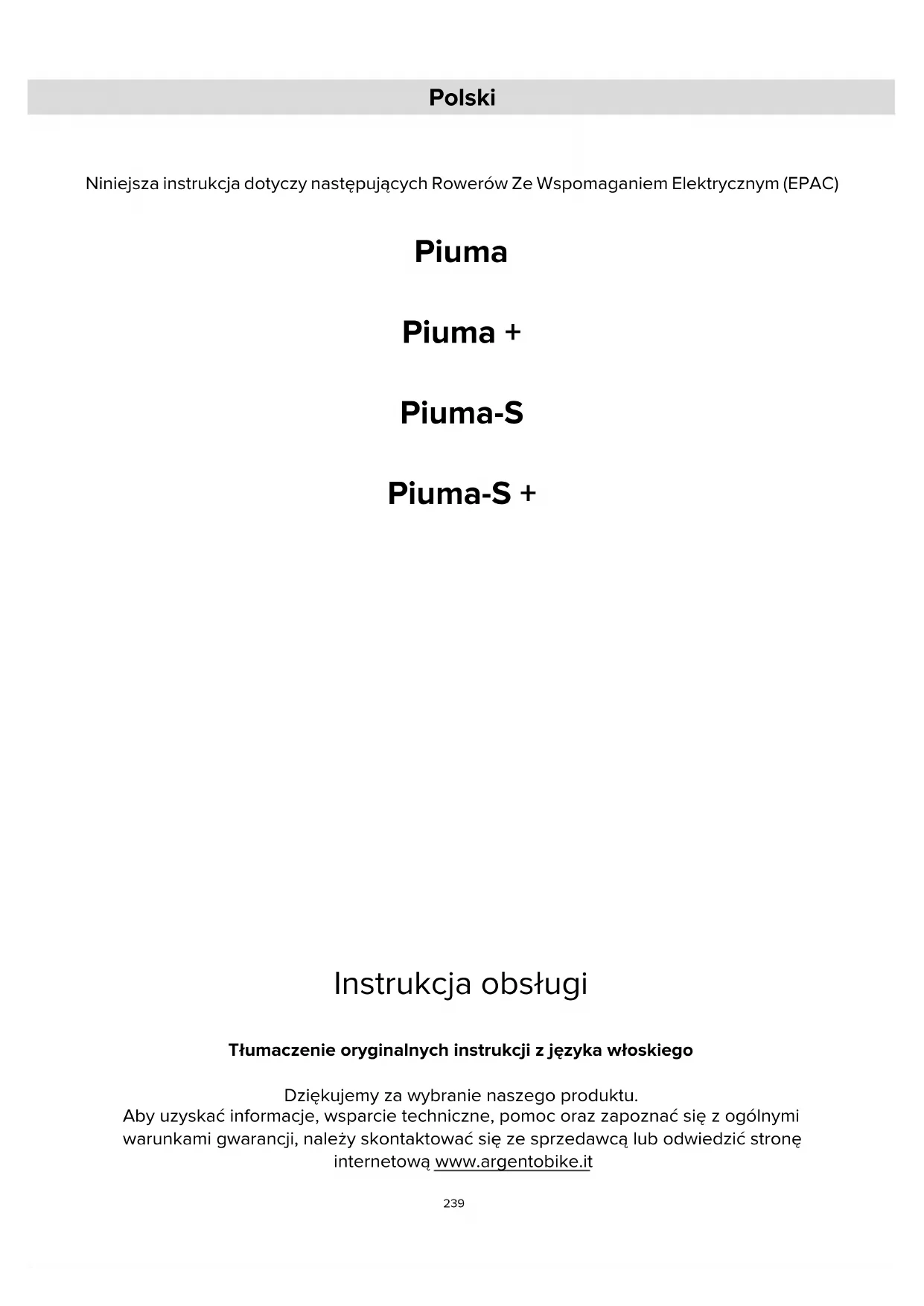 UWAGA Postępowanie ze zużytymi bateriami/akumulatorami (dotyczy wszystkich krajów Unii Europejskiej i innych systemów europejskich, w których przewidziano zbiórkę selektywną) Ten symbol na produkcie lub opakowaniu oznacza, że baterii/akumulatora nie wolno usuwać wraz z odpadami z gospodarstwa domowego. Na niektórych rodzajach akumulatorów ten symbol może być używany w połączeniu z symbolem pierwiastka chemicznego. Symbole chemiczne rtęci (Hg) lub ołowiu (Pb) są dodawane w przypadku, gdy akumulator zawiera więcej niż 0,0005% rtęci lub 0,004% ołowiu. Zapewniając prawidłową utylizację baterii lub akumulatorów, pomożesz zapobiec potencjalnym negatywnym skutkom dla środowiska i zdrowia, które mogłaby spowodować ich niewłaściwa utylizacja. Recykling materiałów pomaga chronić zasoby naturalne. W przypadku produktów, które ze względów bezpieczeństwa, sprawności lub ochrony danych wymagają stałego podłączenia do wewnętrznej baterii lub akumulatora, ich wymiana może być wykonana wyłącznie przez wykwalifikowany personel serwisowy. Po zakończeniu okresu żywotności, przekazać produkt do autoryzowanych punktów zbiórki zużytego sprzętu elektrycznego i elektronicznego: gwarantuje to prawidłową utylizację akumulatora. Aby uzyskać szczegółowe informacje na temat sposobu utylizacji zużytej baterii, akumulatora lub produktu, skontaktować się z lokalnym zakładem utylizacji odpadów lub punktem sprzedaży, w którym zakupiono produkt. W każdym przypadku utylizować zgodnie z przepisami obowiązującymi w kraju zakupu.286 Návod k použití Překlad původního návodu Děkujeme, že jste si vybrali tento výrobek. Informace, technickou podporu, asistenci a všeobecné záruční podmínky získáte u svého prodejce nebo na internetových stránkách www.argentobike.it Čeština Tento návod platí pro následující jízdní kola s asistovaným šlapáním (EPAC). Piuma Piuma + Piuma-S Piuma-S +287