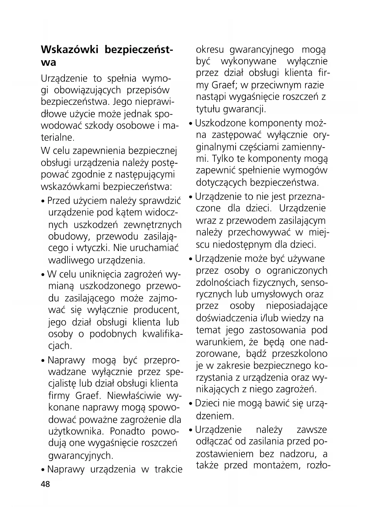 - Naprawy urządzenia w trakcie okresu gwarancyjnego mogą być wykonywane wyłącznie przez dział obsługi klienta r- my Graef; w przeciwnym razie nastąpi wygaśnięcie roszczeń z tytułu gwarancji.
