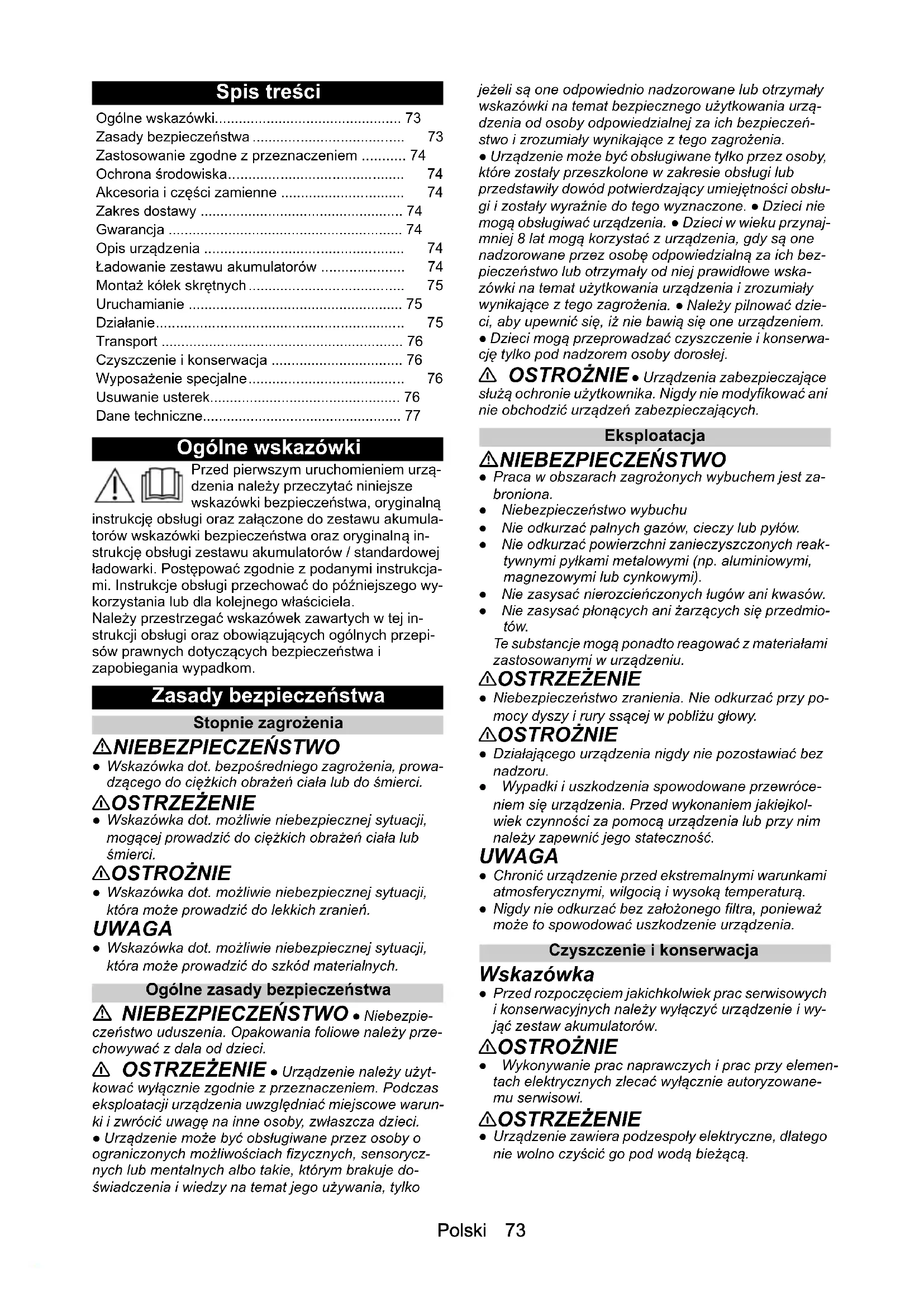 - Naprava se samodejno izklopi Naprava / paket akumulatorskih baterij se je pregrel(-a). Počakajte, da se naprava / paket akumulatorskih baterij ohladi. Upadajoča zmogljivost sesanja Pribor, sesalna gibka cev ali sesalna cev so zamašeni. Zamašitev odstranite z ustreznimi orodji. Filtrirna vrečka je polna. Zamenjajte filtrirno vrečko. Patronski filter je umazan. Očistite penasti filter/patronski filter (glejte poglavje Čiščenje penastega filtra/patronskega filtra). Penasti filter/patronski filter je poškodovan. Zamenjajte penasti filter/patronski filter. Tehnični podatki Pridržujemo si pravico do tehničnih sprememb. WD 2-18 WD 3-18 Električni priključek Stopnja zaščite IPX4 IPX4 Razred zaščite III III Napetost akumulatorja V 18 18 Nazivna moč W 245 245 Količina polnjenja Vsebina posode l 12 17 Podatki o zmogljivosti naprave Obratovalni čas pri polni akumulatorski bateriji pri normalnem obratovanju min 10 18Polski 73 Spis treści Ogólne wskazówki Przed pierwszym uruchomieniem urzą- dzenia należy przeczytać niniejsze wskazówki bezpieczeństwa, oryginalną instrukcję obsługi oraz załączone do zestawu akumula- torów wskazówki bezpieczeństwa oraz oryginalną in- strukcję obsługi zestawu akumulatorów / standardowej ładowarki. Postępować zgodnie z podanymi instrukcja- mi. Instrukcje obsługi przechować do późniejszego wy- korzystania lub dla kolejnego właściciela. Należy przestrzegać wskazówek zawartych w tej in- strukcji obsługi oraz obowiązujących ogólnych przepi- sów prawnych dotyczących bezpieczeństwa i zapobiegania wypadkom. Zasady bezpieczeństwa Stopnie zagrożenia NIEBEZPIECZEŃSTWO ● Wskazówka dot. bezpośredniego zagrożenia, prowa- dzącego do ciężkich obrażeń ciała lub do śmierci. 몇 OSTRZEŻENIE ● Wskazówka dot. możliwie niebezpiecznej sytuacji, mogącej prowadzić do ciężkich obrażeń ciała lub śmierci. 몇 OSTROŻNIE ● Wskazówka dot. możliwie niebezpiecznej sytuacji, która może prowadzić do lekkich zranień. UWAGA ● Wskazówka dot. możliwie niebezpiecznej sytuacji, która może prowadzić do szkód materialnych. Ogólne zasady bezpieczeństwa NIEBEZPIECZEŃSTWO ● Niebezpie- czeństwo uduszenia. Opakowania foliowe należy prze- chowywać z dala od dzieci. 몇 OSTRZEŻENIE ● Urządzenie należy użyt- kować wyłącznie zgodnie z przeznaczeniem. Podczas eksploatacji urządzenia uwzględniać miejscowe warun- ki i zwrócić uwagę na inne osoby, zwłaszcza dzieci. ● Urządzenie może być obsługiwane przez osoby o ograniczonych możliwościach fizycznych, sensorycz- nych lub mentalnych albo takie, którym brakuje do- świadczenia i wiedzy na temat jego używania, tylko jeżeli są one odpowiednio nadzorowane lub otrzymały wskazówki na temat bezpiecznego użytkowania urzą- dzenia od osoby odpowiedzialnej za ich bezpieczeń- stwo i zrozumiały wynikające z tego zagrożenia. ● Urządzenie może być obsługiwane tylko przez osoby, które zostały przeszkolone w zakresie obsługi lub przedstawiły dowód potwierdzający umiejętności obsłu- gi i zostały wyraźnie do tego wyznaczone. ● Dzieci nie mogą obsługiwać urządzenia. ● Dzieci w wieku przynaj- mniej 8 lat mogą korzystać z urządzenia, gdy są one nadzorowane przez osobę odpowiedzialną za ich bez- pieczeństwo lub otrzymały od niej prawidłowe wska- zówki na temat użytkowania urządzenia i zrozumiały wynikające z tego zagroż enia. ● Należy pilnować dzie- ci, aby upewnić się, iż nie bawią się one urządzeniem. ● Dzieci mogą przeprowadzać czyszczenie i konserwa- cję tylko pod nadzorem osoby dorosłej. 몇 OSTROŻNIE ● Urządzenia zabezpieczające służą ochronie użytkownika. Nigdy nie modyfikować ani nie obchodzić urządzeń zabezpieczających. Eksploatacja NIEBEZPIECZEŃSTWO ● Praca w obszarach zagrożonych wybuchem jest za- broniona. ● Niebezpieczeństwo wybuchu ● Nie odkurzać palnych gazów, cieczy lub pyłów. ● Nie odkurzać powierzchni zanieczyszczonych reak- tywnymi pyłkami metalowymi (np. aluminiowymi, magnezowymi lub cynkowymi). ● Nie zasysać nierozcieńczonych ługów ani kwasów. ● Nie zasysać płonących ani żarzących się przedmio- tów. Te substancje mogą ponadto reagować z materiałami zastosowanymi w urządzeniu. 몇 OSTRZEŻENIE ● Niebezpieczeństwo zranienia. Nie odkurzać przy po- mocy dyszy i rury ssącej w pobliżu głowy. 몇 OSTROŻNIE ● Działającego urządzenia nigdy nie pozostawiać bez nadzoru. ● Wypadki i uszkodzenia spowodowane przewróce- niem się urządzenia. Przed wykonaniem jakiejkol- wiek czynności za pomocą urządzenia lub przy nim należy zapewnić jego stateczność. UWAGA ● Chronić urządzenie przed ekstremalnymi warunkami atmosferycznymi, wilgocią i wysoką temperaturą. ● Nigdy nie odkurzać bez założonego filtra, ponieważ może to spowodować uszkodzenie urządzenia. Czyszczenie i konserwacja Wskazówka ● Przed rozpoczęciem jakichkolwiek prac serwisowych i konserwacyjnych należy wyłączyć urządzenie i wy- jąć zestaw akumulatorów. 몇 OSTROŻNIE ● Wykonywanie prac naprawczych i prac przy elemen- tach elektrycznych zlecać wyłącznie autoryzowane- mu serwisowi. 몇 OSTRZEŻENIE ● Urządzenie zawiera podzespoły elektryczne, dlatego nie wolno czyścić go pod wodą bieżącą. Ogólne wskazówki p. 73