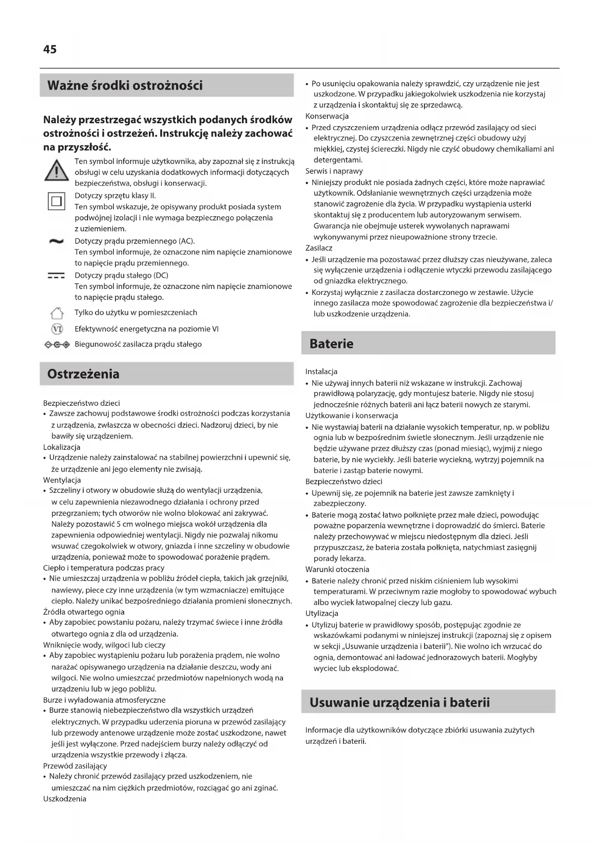 Ten symbol informuje użytkownika, aby zapoznał się z instrukcją obsługi w celu uzyskania dodatkowych informacji dotyczących bezpieczeństwa, obsługi i konserwacji. Dotyczy sprzętu klasy II. Ten symbol wskazuje, że opisywany produkt posiada system podwójnej izolacji i nie wymaga bezpiecznego połączenia zuziemieniem. Dotyczy prądu przemiennego (AC). Ten symbol informuje, że oznaczone nim napięcie znamionowe to napięcie prądu przemiennego. Dotyczy prądu stałego (DC) Ten symbol informuje, że oznaczone nim napięcie znamionowe to napięcie prądu stałego. Tylko do użytku w pomieszczeniach Efektywność energetyczna na poziomie VI Biegunowość zasilacza prądu stałego Ostrzeżenia Bezpieczeństwo dzieci