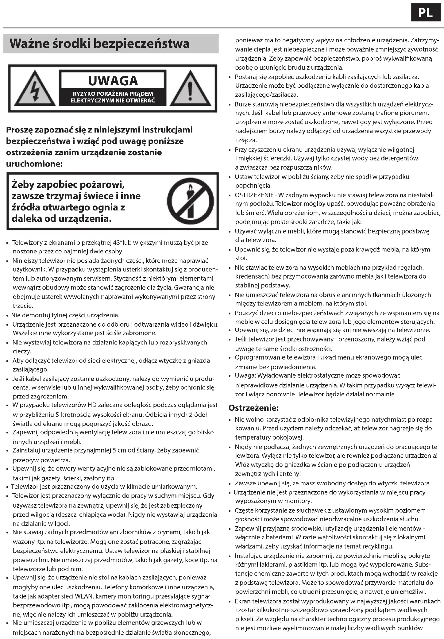 - Uwaga: Wyładowanie elektrostatyczne może spowodować nieprawidłowe działanie urządzenia. W takim przypadku wyłącz telewi- zor i włącz ponownie. Telewizor będzie działał normalnie. Ostrzeżenie:
