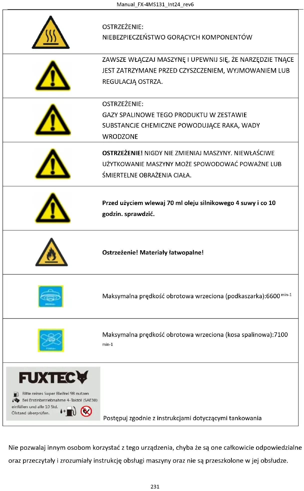 maszyna i narzędzia tnące się zatrzymały. ⚫ Maszyna musi być WYŁĄCZONA przed zmianą obszaru roboczego maszyny. ⚫ Upewnij się, że nylonowa głowica tnąca nie uderza w kamienie ani inne twarde przedmioty. ⚫ Zawsze upewnij się, że się nie poluzowały lub że maszyna się nie przegrzewa. ⚫ W razie potrzeby oddaj maszynę do serwisu u autoryzowanego dealera. Jeśli maszyna jest uszkodzona, nie kontynuuj jej uruchamiania. ⚫ Podczas uruchamiania lub obsługi maszyny nigdy nie dotykaj gorących części, takich jak wydech, przewody zapłonowe lub świeca zapłonowa. ⚫ Po zatrzymaniu maszyny wydech jest nadal gorący. Nigdy nie umieszczaj maszyny w pobliżu materiałów łatwopalnych (sucha trawa, łatwopalne gazy lub łatwopalne ciecze itp.). ⚫ Zwróć szczególną uwagę na fakt, że podczas pracy w deszczu lub bezpośrednio po deszczu podłoże może być gładkie. ⚫ Jeśli poślizgniesz się lub upadniesz na ziemię, natychmiast zwolnij przepustnicę. ⚫ Uważaj, aby nie upuścić maszyny ani nie uderzyć w przeszkody. ⚫ Przed regulacją lub naprawą maszyny upewnij się, że maszyna jest zatrzymana, a złącze świecy zapłonowej wyjęte. ⚫ Jeśli maszyna ma być przechowywana przez długi czas, spuść paliwo ze zbiornika paliwa i gaźnika, wyczyść części, umieść maszynę w bezpiecznym miejscu i upewnij się, że maszyna znajduje się w bezpiecznym miejscu. że maszyna całkowicie ostygła. ⚫ Przeprowadzaj ciągłe kontrole, aby zapewnić bezpieczną i wydajną pracę. W celu przeprowadzenia pełnej kontroli maszyny należy skontaktować się ze specjalistycznym warsztatem. ⚫ Trzymaj maszynę z dala od ognia lub iskier. ⚫ Zachowaj ostrożność podczas korzystania z niego. Istnieje ryzyko odrzutu i odrzutu. ⚫ Zachowaj szczególną ostrożność podczas używania tej maszyny z ostrzem tnącym. Odrzut ostrza tnącego to reakcja, która może wystąpić, gdy obracające się ostrze tnące uderzy w przedmiot, którego nie można przeciąć. Kontakt ten powoduje, że ostrza tnące zatrzymują się na chwilę, a następnie nagle odpychają uderzony przedmiot z przyspieszoną siłą. Ta reakcja odrzutu może być na tyle gwałtowna, że operator traci kontrolę nad maszyną. Odrzut ostrza tnącego może nastąpić bez ostrzeżenia, jeśli ostrze tnące napotka przeszkodę, zostanie zablokowane lub utknie. Jest to bardziej prawdopodobne w obszarach, w których trudno jest śledzić materiał, który ma być cięty. Aby uzyskać łatwe i bezpieczne cięcie, zajmij się chwastami, które chcesz przyciąć od prawej do lewej. W przypadku nieoczekiwanego uderzenia w przedmiot lub drewniany kij, może to zmniejszyć odrzut ostrza tnącego.Manual_FX-4MS131_Int24_rev6
