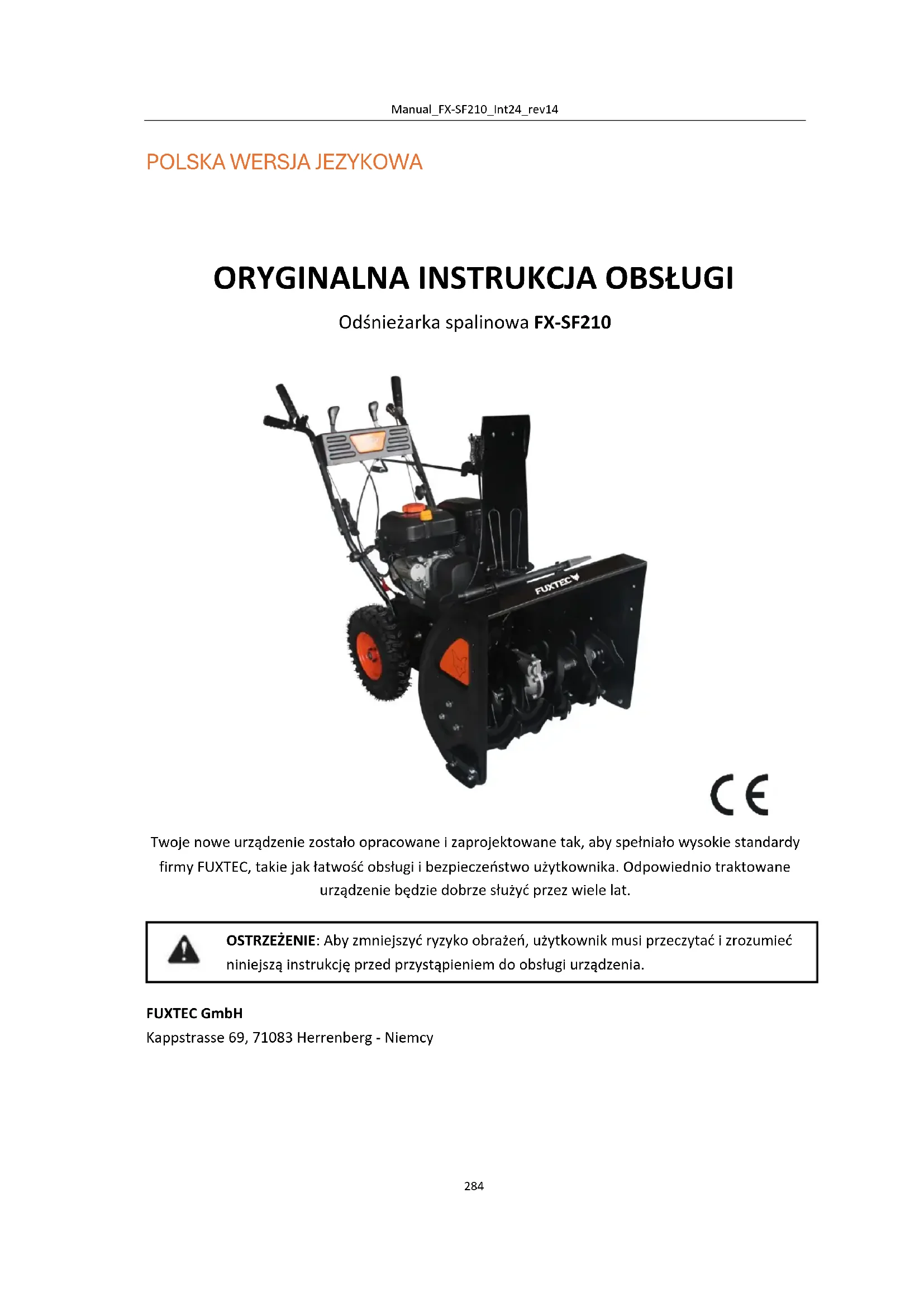 Twoje nowe urządzenie zostało opracowane i zaprojektowane tak, aby spełniało wysokie standardy firmy FUXTEC, takie jak łatwość obsługi i bezpieczeństwo użytkownika. Odpowiednio traktowane urządzenie będzie dobrze służyć przez wiele lat. OSTRZEŻENIE: Aby zmniejszyć ryzyko obrażeń, użytkownik musi przeczytać i zrozumieć niniejszą instrukcję przed przystąpieniem do obsługi urządzenia. FUXTEC GmbH Kappstrasse 69, 71083 Herrenberg - NiemcyManual_FX-SF210_Int24_rev14