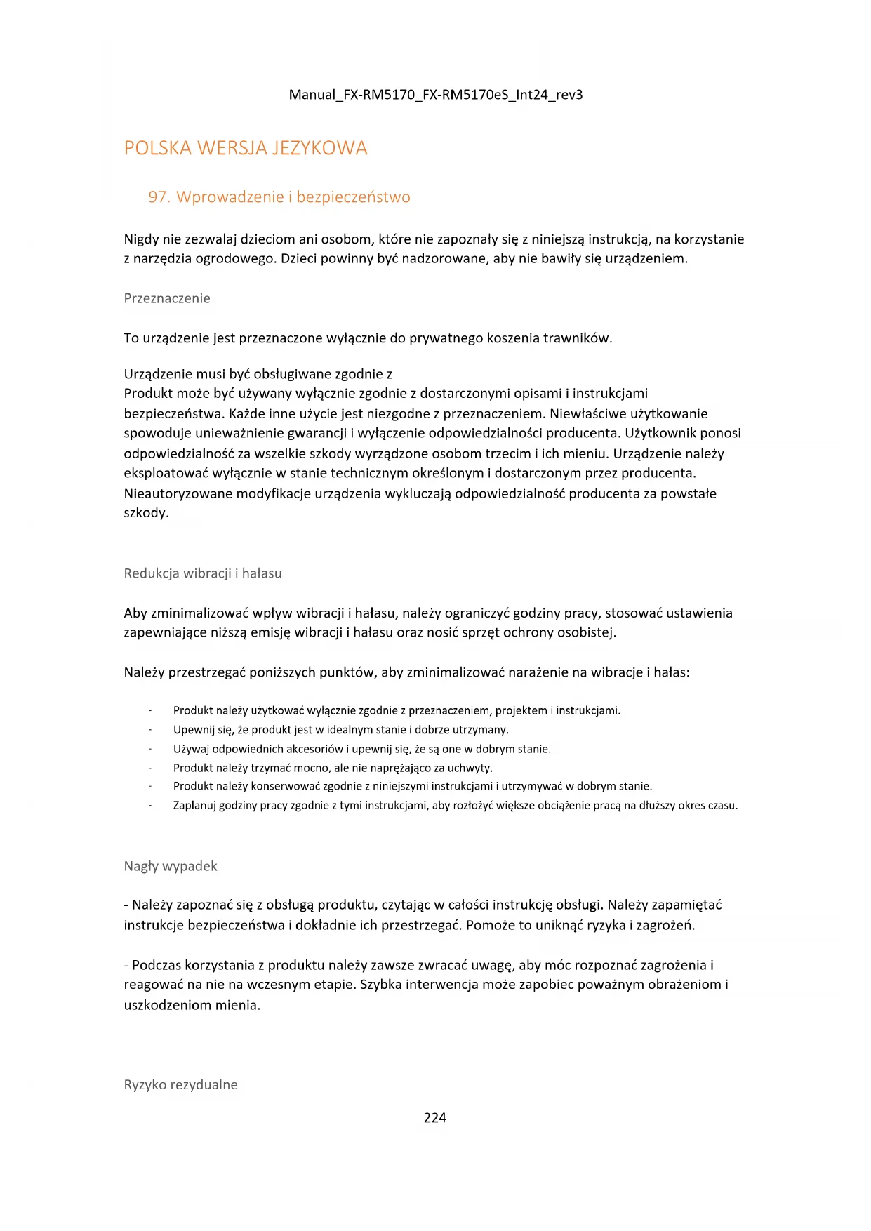 Ogólne instrukcje bezpieczeństwa - Dla własnego bezpieczeństwa i bezpieczeństwa innych osób, przed rozpoczęciem korzystania z urządzenia należy zapoznać się z niniejszą instrukcją obsługi i instrukcjami bezpieczeństwa. Należy zachować instrukcję obsługi i ich instrukcje bezpieczeństwa do późniejszego wykorzystania i przechowywać je w bezpiecznym miejscu do wykorzystania w przyszłości. gotowe do użycia w każdej sytuacji. - Przekazać instrukcję obsługi wraz z urządzeniem, jeśli zmieni ono właściciela. - Osoby obsługujące urządzenie nie mogą znajdować się pod wpływem środków odurzających (np. alkoholu, narkotyków lub leków). - Urządzenie należy eksploatować wyłącznie w trybie pracy zalecanym i dostarczonym przez producenta. stan techniczny. Nieautoryzowane modyfikacje urządzenia wykluczają odpowiedzialność producenta za wynikające z nich szkody. - Z urządzenia należy korzystać wyłącznie w świetle dziennym lub przy dobrym oświetleniu sztucznym. - Z urządzenia należy korzystać wyłącznie w suchych warunkach pogodowych. Należy trzymać je z dala od deszczu lub wilgoci. Przedostanie się wody do wnętrza urządzenia zwiększa ryzyko porażenia prądem. - Wyłącz urządzenie i wyjmij baterię w następujących warunkach: ⬧ jeśli urządzenie zostanie pozostawione bez nadzoru; ⬧ jeśli urządzenie zacznie nadmiernie wibrować.Manual_FX-RM5170_FX-RM5170eS_Int24_rev3