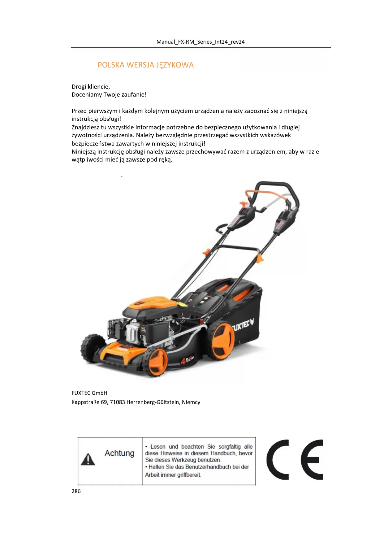 - Należy uważnie przeczytać instrukcję obsługi. Należy zapoznać się z elementami sterującymi i prawidłowym użytkowaniem urządzenia. - Nigdy nie należy umieszczać rąk ani stóp w pobliżu obracających się części urządzenia. Przez cały czas należy trzymać się z dala od otworu wylotowego - Z urządzenia mogą korzystać wyłącznie odpowiedzialni użytkownicy, którzy są zaznajomieni z jego obsługą. - Dokładnie sprawdź obszar, w którym urządzenie ma być używane i usuń wszelkie przedmioty, które mogłyby zostać wyrzucone przez urządzenie. - Nigdy nie używaj urządzenia, gdy w pobliżu znajdują się ludzie, zwłaszcza dzieci lub zwierzęta. - Podczas korzystania z urządzenia należy zawsze nosić solidne obuwie i długie spodnie. Nie używaj urządzenia, jeśli jesteś boso lub nosisz otwarte sandały. - Nie ciągnąć maszyny do tyłu, jeśli nie jest to absolutnie konieczne. Przed i podczas cofania maszyny należy zawsze patrzeć w dół i za siebie. - Nigdy nie używaj kosiarki z uszkodzonymi osłonami lub bez osłon - np. z nieprawidłowo zamontowanymi deflektorami i/lub koszami na ścinki. - Używaj wyłącznie akcesoriów zalecanych przez producenta - Zatrzymaj ostrza podczas przejeżdżania przez żwirowe podjazdy, ścieżki lub drogi. - Zatrzymaj silnik i odłącz nasadkę świecy zapłonowej od świecy zapłonowej, - przed usunięciem zatorów i oczyszczeniem kanału tnącego. - przed sprawdzeniem, czyszczeniem lub pracami przy urządzeniu. - po wykryciu ciała obcego. Sprawdź urządzenie pod kątem uszkodzeń i napraw je przed ponownym użyciem kosiarki. - Jeśli kosiarka wibruje wyjątkowo mocno, należy natychmiast sprawdzić jej działanie. - Przed wyjęciem kosza na ścinki wyłącz silnik i poczekaj, aż ostrza tnące całkowicie się zatrzymają. - Z urządzenia należy korzystać wyłącznie w świetle dziennym lub w miejscach dobrze oświetlonych sztucznym światłem. - Nie wolno obsługiwać urządzenia pod wpływem alkoholu lub narkotyków. - Nigdy nie używaj maszyny na wilgotnej trawie. Niestabilna podstawa może doprowadzić do poślizgnięcia. Podczas koszenia należy mocno trzymać uchwyty. Nigdy nie uruchamiaj urządzenia podczas pracy. - Przed uruchomieniem silnika należy zwolnić mechanizm samobieżny. - Wymienić uszkodzone tłumiki. - Podczas korzystania z kosiarki należy zawsze nosić okulary lub gogle ochronne z osłonami bocznymi. - Usuń przeszkody, takie jak kamienie, szczątki drzew itp. - Uważaj na doły, bruzdy lub kopce. Wysoka trawa może ukrywać ciała obce. - Nie należy kosić wzdłuż różnic wysokości, rowów lub nasypów. Użytkownik urządzenia może stracić równowagę i równowagę. - Nie kosić na zbyt stromych zboczach. - Należy pamiętać, że użytkownik urządzenia ponosi odpowiedzialność za wypadki lub obrażenia innych osób lub mienia. - Należy zachować ostrożność i wyłączyć urządzenie, jeśli w obszarze roboczym znajdują się dzieci. - W przypadku maszyn rotacyjnych należy kosić poziomo, a nie pionowo w poprzek zbocza. - Nigdy nie zezwalaj na obsługę tej kosiarki dzieciom lub osobom, które nie są zaznajomione z jej obsługą. Lokalne przepisy mogą ograniczać wiek użytkownika. - OSTRZEŻENIE - Benzyna jest wysoce łatwopalna. - Benzynę należy przechowywać w przeznaczonych do tego celu pojemnikach.Manual_FX-RM_Series_Int24_rev24