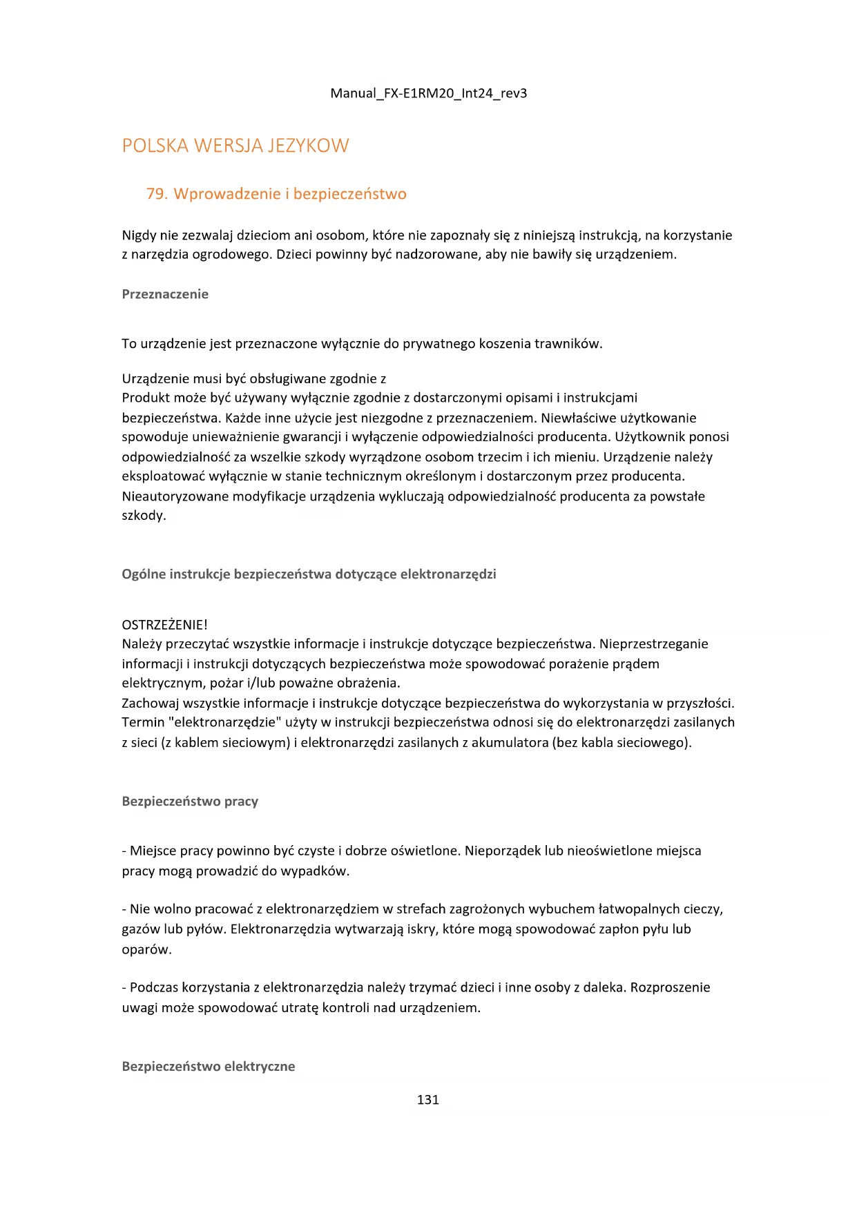 Ogólne instrukcje bezpieczeństwa - Dla własnego bezpieczeństwa i bezpieczeństwa innych osób, przed rozpoczęciem korzystania z urządzenia należy zapoznać się z niniejszą instrukcją obsługi i instrukcjami bezpieczeństwa. Należy zachować instrukcję obsługi i ich instrukcje bezpieczeństwa do późniejszego wykorzystania i przechowywać je w bezpiecznym miejscu do wykorzystania w przyszłości. gotowe do użycia w każdej chwili. - Przekazać instrukcję obsługi wraz z urządzeniem, jeśli zmieni ono właściciela. - Osoby obsługujące urządzenie nie mogą znajdować się pod wpływem środków odurzających (np. alkoholu, narkotyków lub leków). - Urządzenie należy eksploatować wyłącznie w trybie pracy zalecanym i dostarczonym przez producenta. stan techniczny. Nieautoryzowane modyfikacje urządzenia wykluczają odpowiedzialność producenta za wynikające z nich szkody. - Z urządzenia należy korzystać wyłącznie w świetle dziennym lub przy dobrym oświetleniu sztucznym. - Z urządzenia należy korzystać wyłącznie w suchych warunkach pogodowych. Należy trzymać je z dala od deszczu lub wilgoci. Przedostanie się wody do wnętrza urządzenia zwiększa ryzyko porażenia prądem.Manual_FX-E1RM20_Int24_rev3