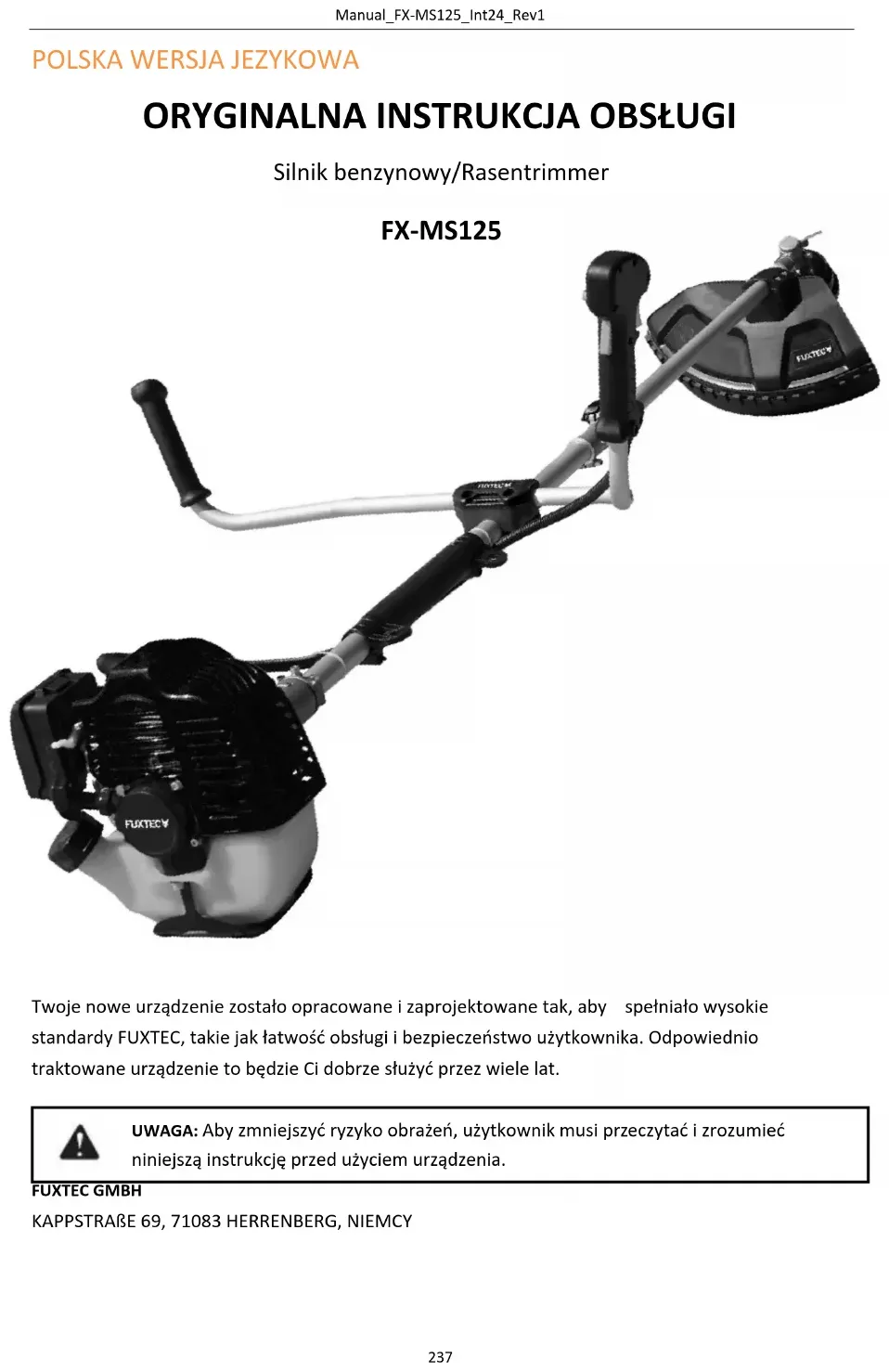 Twoje nowe urządzenie zostało opracowane i zaprojektowane tak, aby spełniało wysokie standardy FUXTEC, takie jak łatwość obsługi i bezpieczeństwo użytkownika. Odpowiednio traktowane urządzenie to będzie Ci dobrze służyć przez wiele lat. UWAGA: Aby zmniejszyć ryzyko obrażeń, użytkownik musi przeczytać i zrozumieć niniejszą instrukcję przed użyciem urządzenia. FUXTEC GMBH KAPPSTRAßE 69, 71083 HERRENBERG, NIEMCYManual_FX-MS125_Int24_Rev1