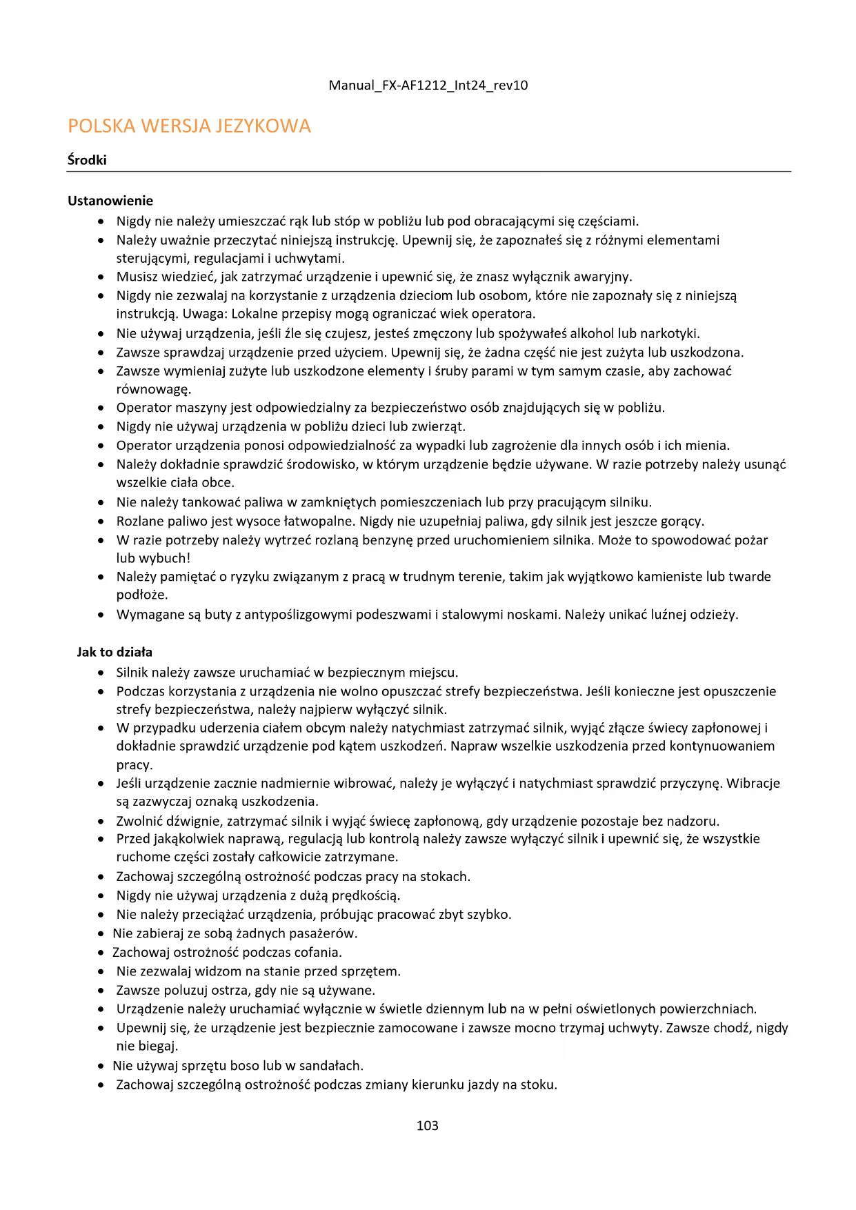 Różne ● Przekładnia jest dobrze nasmarowana w momencie dostawy. Należy jednak upewnić się, że jest dobrze nasmarowana przed każdym użyciem. ● Silnik nie jest wstępnie napełniony olejem. ● Nie zdejmuj ani nie zwalniaj żadnych fabrycznie zamontowanych elementów sterowania, takich jak linka sprzęgła przymocowana do uchwytu. ● Zbiornik paliwa należy opróżniać wyłącznie na zewnątrz. Paliwo jest bardzo łatwopalne, a jego opary są wybuchowe. ● Upewnij się, że urządzenie jest bezpiecznie zamocowane podczas transportu na ciężarówce z płaską platformą lub podobnym środku transportu.Manual_FX-AF1212_Int24_rev10