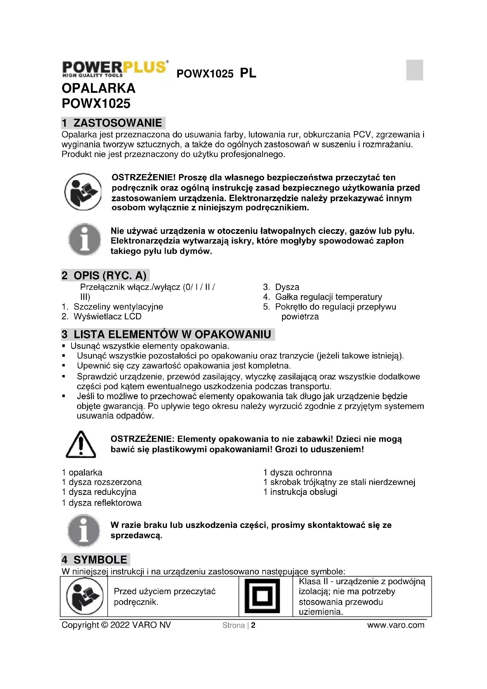 Klasa II - urządzenie z podwójną izolacją; nie ma potrzeby stosowania przewodu uziemienia.POWX1025 PL Copyright © 2022 VARO NV Strona | 3 www.varo.com