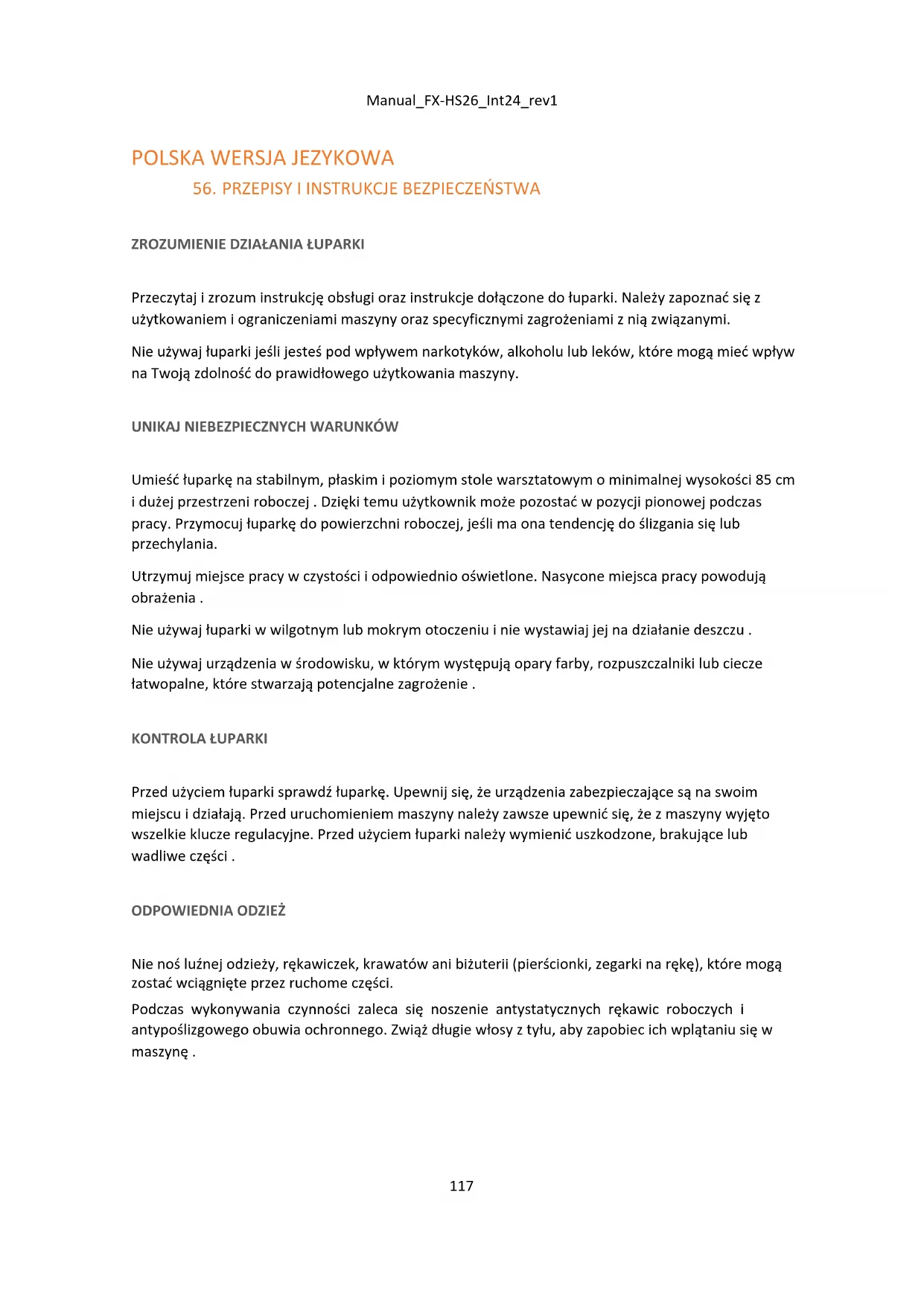 Umieść łuparkę na stabilnym, płaskim i poziomym stole warsztatowym o minimalnej wysokości 85 cm i dużej przestrzeni roboczej . Dzięki temu użytkownik może pozostać w pozycji pionowej podczas pracy. Przymocuj łuparkę do powierzchni roboczej, jeśli ma ona tendencję do ślizgania się lub przechylania. Utrzymuj miejsce pracy w czystości i odpowiednio oświetlone. Nasycone miejsca pracy powodują obrażenia . Nie używaj łuparki w wilgotnym lub mokrym otoczeniu i nie wystawiaj jej na działanie deszczu . Nie używaj urządzenia w środowisku, w którym występują opary farby, rozpuszczalniki lub ciecze łatwopalne, które stwarzają potencjalne zagrożenie . KONTROLA ŁUPARKI Przed użyciem łuparki sprawdź łuparkę. Upewnij się, że urządzenia zabezpieczające są na swoim miejscu i działają. Przed uruchomieniem maszyny należy zawsze upewnić się, że z maszyny wyjęto wszelkie klucze regulacyjne. Przed użyciem łuparki należy wymienić uszkodzone, brakujące lub wadliwe części . ODPOWIEDNIA ODZIEŻ Nie noś luźnej odzieży, rękawiczek, krawatów ani biżuterii (pierścionki, zegarki na rękę), które mogą zostać wciągnięte przez ruchome części. Podczas wykonywania czynności zaleca się noszenie antystatycznych rękawic roboczych i antypoślizgowego obuwia ochronnego. Zwiąż długie włosy z tyłu, aby zapobiec ich wplątaniu się w maszynę .Manual_FX-HS26_Int24_rev1