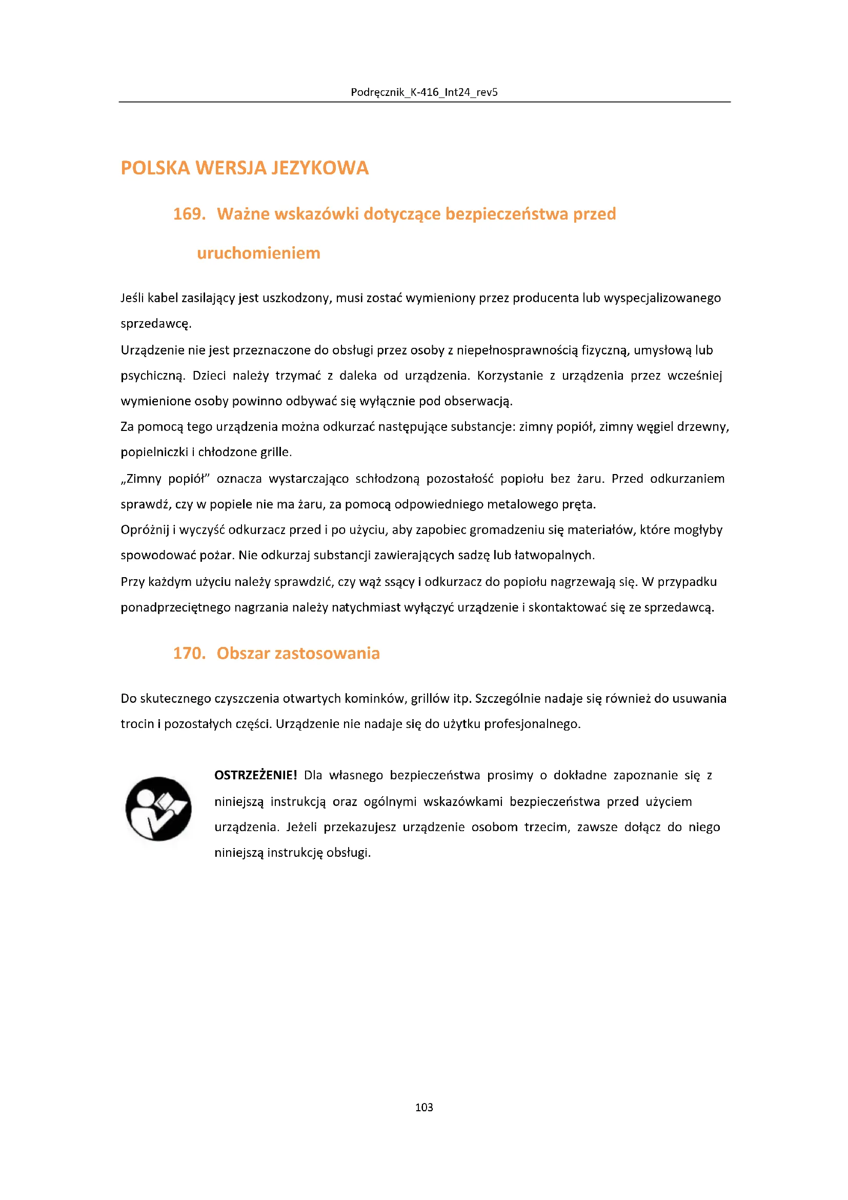 Do skutecznego czyszczenia otwartych kominków, grillów itp. Szczególnie nadaje się również do usuwania trocin i pozostałych części. Urządzenie nie nadaje się do użytku profesjonalnego. OSTRZEŻENIE! Dla własnego bezpieczeństwa prosimy o dokładne zapoznanie się z niniejszą instrukcją oraz ogólnymi wskazówkami bezpieczeństwa przed użyciem urządzenia. Jeżeli przekazujesz urządzenie osobom trzecim, zawsze dołącz do niego niniejszą instrukcję obsługi.Podręcznik_K-416_Int24_rev5