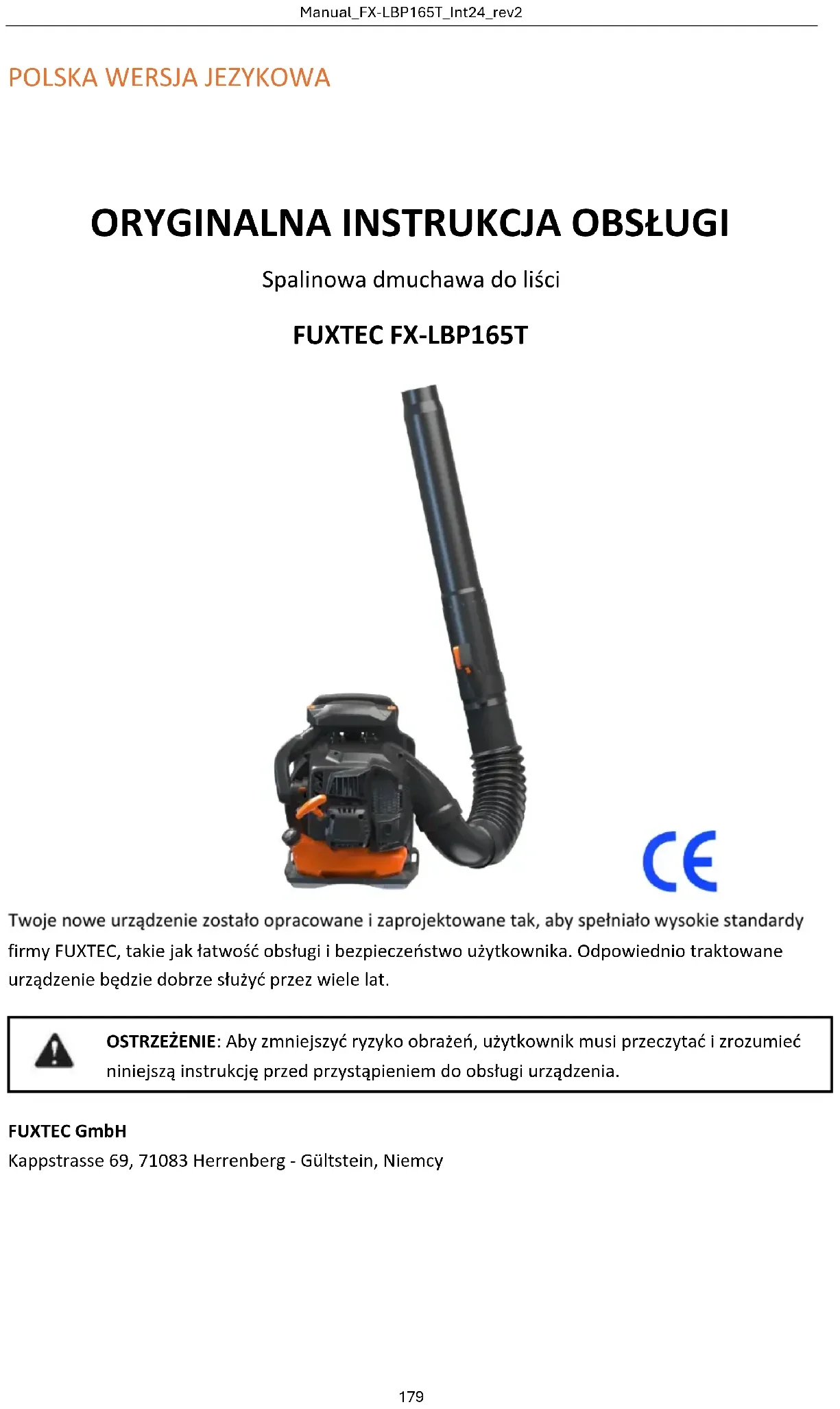 Twoje nowe urządzenie zostało opracowane i zaprojektowane tak, aby spełniało wysokie standardy firmy FUXTEC, takie jak łatwość obsługi i bezpieczeństwo użytkownika. Odpowiednio traktowane urządzenie będzie dobrze służyć przez wiele lat. OSTRZEŻENIE: Aby zmniejszyć ryzyko obrażeń, użytkownik musi przeczytać i zrozumieć niniejszą instrukcję przed przystąpieniem do obsługi urządzenia. FUXTEC GmbH Kappstrasse 69, 71083 Herrenberg - Gültstein, NiemcyManual_FX-LBP165T_Int24_rev2