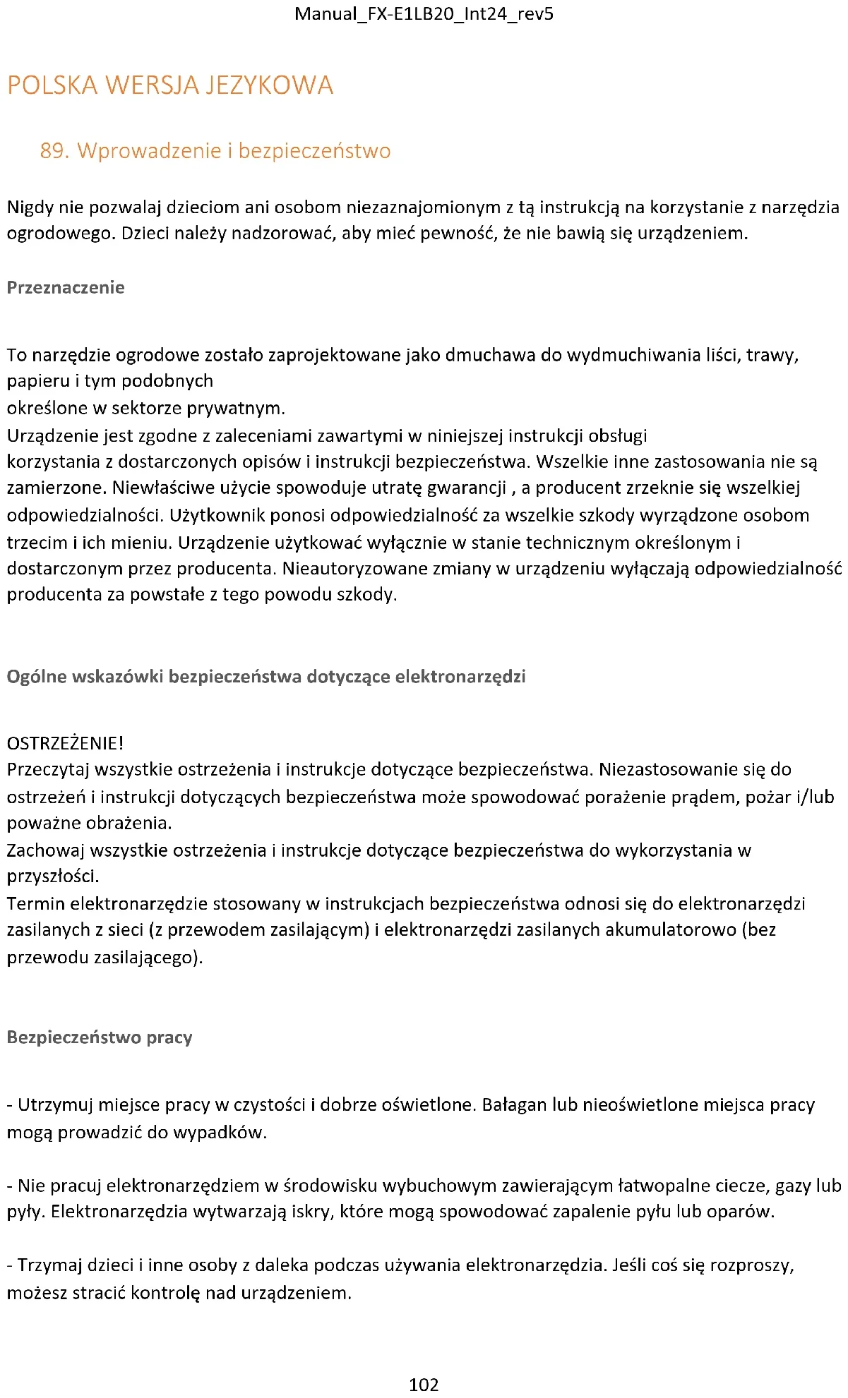 Ogólne instrukcje bezpieczeństwa - Dla własnego bezpieczeństwa i bezpieczeństwa innych osób, przed użyciem urządzenia przeczytaj niniejszą instrukcję obsługi i zawarte w niej wskazówki dotyczące bezpieczeństwa. Proszę zachować instrukcję obsługi i zachowaj instrukcje bezpieczeństwa do późniejszego wykorzystania każde zastosowanie pod ręką. - Przekazać instrukcję obsługi wraz z urządzeniem w przypadku zmiany właściciela. - Osoby obsługujące urządzenie nie mogą znajdować się pod wpływem środków odurzających (np. alkoholu, narkotyków lub leków). - Urządzenie należy obsługiwać wyłącznie w sposób zalecany i dostarczony przez producenta stan techniczny. Nieautoryzowane zmiany w urządzeniu wyłączają odpowiedzialność producenta za powstałe z tego powodu szkody. - Używaj urządzenia wyłącznie przy świetle dziennym lub przy dobrym sztucznym oświetleniu. - Używaj urządzenia wyłącznie przy suchej pogodzie. Trzymaj go z dala od deszczu i wilgoci. Dostanie się wody do urządzenia zwiększa ryzyko porażenia prądem. - Wyłącz urządzenie i wyjmij baterię w następujących sytuacjach: ⬧jeśli urządzenie pozostanie bez nadzoru; ⬧przed sprawdzeniem, czyszczeniem lub wykonaniem jakichkolwiek innych prac na urządzeniu; ⬧jeśli urządzenie zacznie nadmiernie wibrować. Przed użyciem - Przed rozpoczęciem pracy należy zapoznać się z dmuchawą, jej funkcjami i sterowaniem. - Przed użyciem i po uderzeniu sprawdź urządzenie pod kątem oznak zużycia lub uszkodzeń.Manual_FX-E1LB20_Int24_rev5