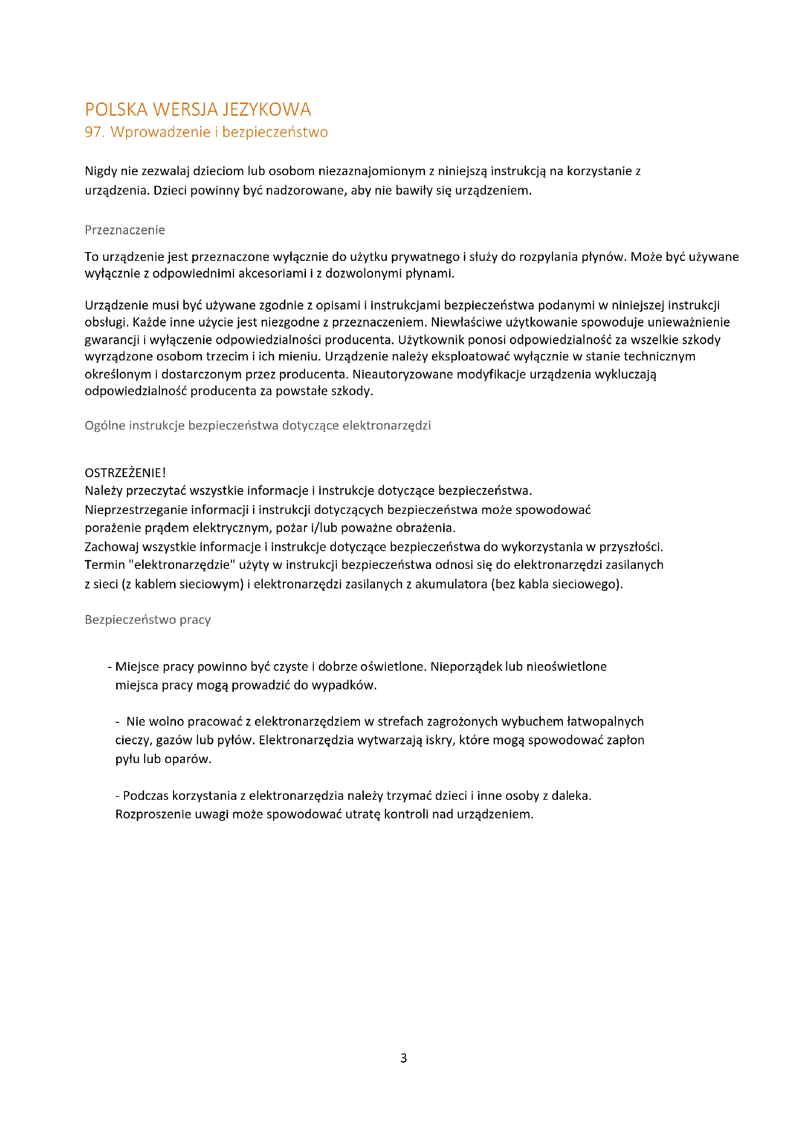 Nigdy nie zezwalaj dzieciom lub osobom niezaznajomionym z niniejszą instrukcją na korzystanie z urządzenia. Dzieci powinny być nadzorowane, aby nie bawiły się urządzeniem. Przeznaczenie To urządzenie jest przeznaczone wyłącznie do użytku prywatnego i służy do rozpylania płynów. Może być używane wyłącznie z odpowiednimi akcesoriami i z dozwolonymi płynami. Urządzenie musi być używane zgodnie z opisami i instrukcjami bezpieczeństwa podanymi w niniejszej instrukcji obsługi. Każde inne użycie jest niezgodne z przeznaczeniem. Niewłaściwe użytkowanie spowoduje unieważnienie gwarancji i wyłączenie odpowiedzialności producenta. Użytkownik ponosi odpowiedzialność za wszelkie szkody wyrządzone osobom trzecim i ich mieniu. Urządzenie należy eksploatować wyłącznie w stanie technicznym określonym i dostarczonym przez producenta. Nieautoryzowane modyfikacje urządzenia wykluczają odpowiedzialność producenta za powstałe szkody. Ogólne instrukcje bezpieczeństwa dotyczące elektronarzędzi OSTRZEŻENIE! Należy przeczytać wszystkie informacje i instrukcje dotyczące bezpieczeństwa. Nieprzestrzeganie informacji i instrukcji dotyczących bezpieczeństwa może spowodować porażenie prądem elektrycznym, pożar i/lub poważne obrażenia. Zachowaj wszystkie informacje i instrukcje dotyczące bezpieczeństwa do wykorzystania w przyszłości. Termin "elektronarzędzie" użyty w instrukcji bezpieczeństwa odnosi się do elektronarzędzi zasilanych z sieci (z kablem sieciowym) i elektronarzędzi zasilanych z akumulatora (bez kabla sieciowego). Bezpieczeństwo pracy - Miejsce pracy powinno być czyste i dobrze oświetlone. Nieporządek lub nieoświetlone miejsca pracy mogą prowadzić do wypadków. - Nie wolno pracować z elektronarzędziem w strefach zagrożonych wybuchem łatwopalnych cieczy, gazów lub pyłów. Elektronarzędzia wytwarzają iskry, które mogą spowodować zapłon pyłu lub oparów. - Podczas korzystania z elektronarzędzia należy trzymać dzieci i inne osoby z daleka. Rozproszenie uwagi może spowodować utratę kontroli nad urządzeniem.4