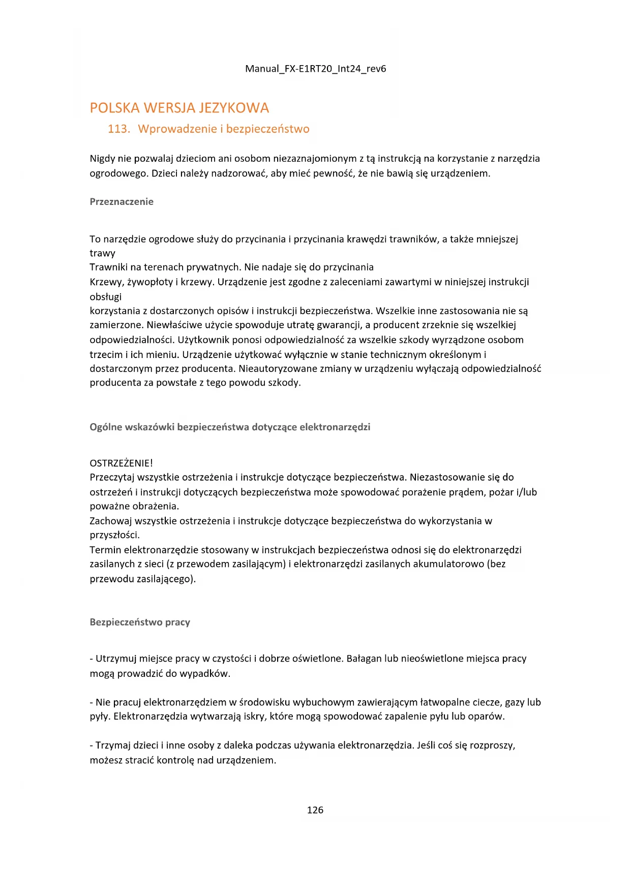 Ogólne instrukcje bezpieczeństwa - Dla własnego bezpieczeństwa i bezpieczeństwa innych osób, przed użyciem urządzenia przeczytaj niniejszą instrukcję obsługi i zawarte w niej wskazówki dotyczące bezpieczeństwa. Proszę zachować instrukcję obsługi i zachowaj instrukcje bezpieczeństwa do późniejszego wykorzystania każde zastosowanie pod ręką. - Przekazać instrukcję obsługi wraz z urządzeniem w przypadku zmiany właściciela. - Osoby obsługujące urządzenie nie mogą znajdować się pod wpływem środków odurzających (np. alkoholu, narkotyków lub leków). - Urządzenie należy obsługiwać wyłącznie w sposób zalecany i dostarczony przez producenta stan techniczny. Nieautoryzowane zmiany w urządzeniu wyłączają odpowiedzialność producenta za powstałe z tego powodu szkody. - Używaj urządzenia wyłącznie przy świetle dziennym lub przy dobrym sztucznym oświetleniu. - Używaj urządzenia wyłącznie przy suchej pogodzie. Trzymaj go z dala od deszczu i wilgoci. Dostanie się wody do urządzenia zwiększa ryzyko porażenia prądem. - Wyłącz urządzenie i wyjmij baterię w następujących sytuacjach: ⬧jeśli urządzenie pozostanie bez nadzoru; ⬧przed sprawdzeniem, czyszczeniem lub wykonaniem jakichkolwiek innych prac na urządzeniu; ⬧jeśli urządzenie zacznie nadmiernie wibrować.Manual_FX-E1RT20_Int24_rev6