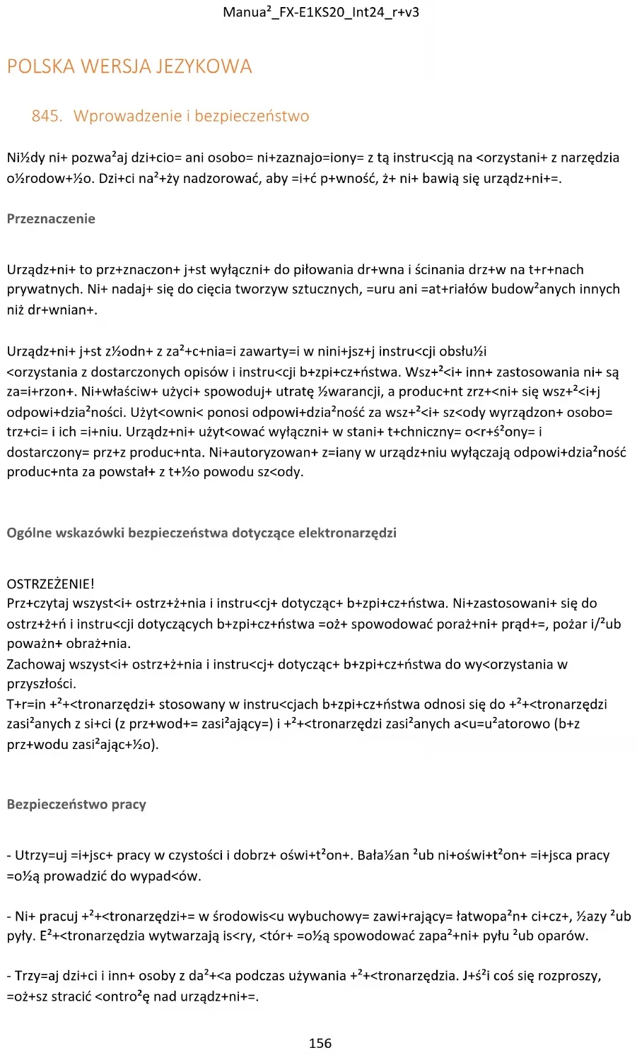 Użycie i obsługa elektronarzędzia - Nie przeciążaj urządzenia. Do swojej pracy używaj wyznaczonego elektronarzędzia. Dzięki odpowiedniemu elektronarzędziu możesz pracować lepiej i bezpieczniej w określonym zakresie wydajności. - Nie używaj elektronarzędzia, którego wyłącznik jest uszkodzony. Elektronarzędzie, którego nie można już włączyć ani wyłączyć, jest niebezpieczne i należy je naprawić. - Odłącz urządzenie i/lub wyjmij baterię przed dokonaniem regulacji urządzenia, wymianą akcesoriów lub odłożeniem urządzenia. Ten środek ostrożności zapobiega niezamierzonemu uruchomieniu elektronarzędzia. - Nieużywane elektronarzędzia należy przechowywać poza zasięgiem dzieci. Nie pozwalaj na użytkowanie urządzenia osobom, które nie są zaznajomione z nim lub niniejszą instrukcją nie przeczytałem. Elektronarzędzia są niebezpieczne, jeśli są używane przez niedoświadczone osoby. - Ostrożnie konserwuj elektronarzędzia. Sprawdź, czy części ruchome działają prawidłowo i nie zacinają się, czy części nie są popękane lub uszkodzone w sposób uniemożliwiający działanie elektronarzędzie jest uszkodzone. Przed użyciem urządzenia należy naprawić uszkodzone części. Wiele wypadków jest powodowanych przez źle konserwowane elektronarzędzia. - Utrzymuj narzędzia tnące ostre i czyste. Starannie konserwowane narzędzia tnące z ostrymi krawędziami tnącymi są mniej podatne na zacięcia i są lżejsze prowadzić. - Używaj elektronarzędzi, akcesoriów, narzędzi do wkładania itp. zgodnie z niniejszą instrukcją. Należy wziąć pod uwagę warunki pracy i rodzaj wykonywanej czynności. Używanie elektronarzędzi do zastosowań innych niż te, do których są przeznaczone, może spowodować prowadzić do niebezpiecznych sytuacji.Manual_FX-E1KS20_Int24_rev3