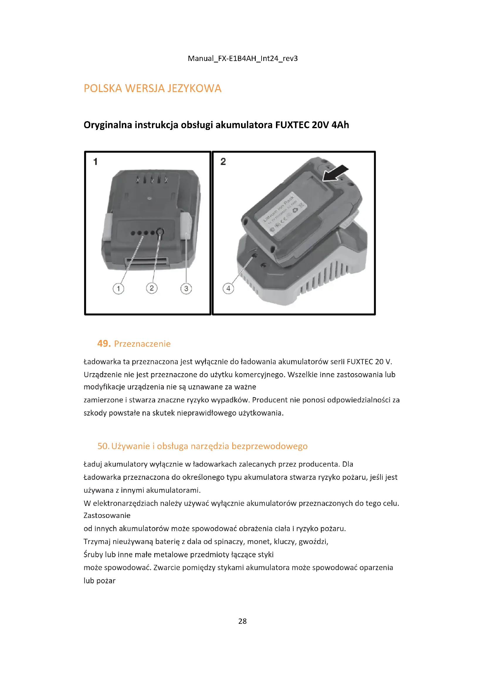Ładuj akumulatory wyłącznie w ładowarkach zalecanych przez producenta. Dla Ładowarka przeznaczona do określonego typu akumulatora stwarza ryzyko pożaru, jeśli jest używana z innymi akumulatorami. W elektronarzędziach należy używać wyłącznie akumulatorów przeznaczonych do tego celu. Zastosowanie od innych akumulatorów może spowodować obrażenia ciała i ryzyko pożaru. Trzymaj nieużywaną baterię z dala od spinaczy, monet, kluczy, gwoździ, Śruby lub inne małe metalowe przedmioty łączące styki może spowodować. Zwarcie pomiędzy stykami akumulatora może spowodować oparzenia lub pożarManual_FX-E1B4AH_Int24_rev3