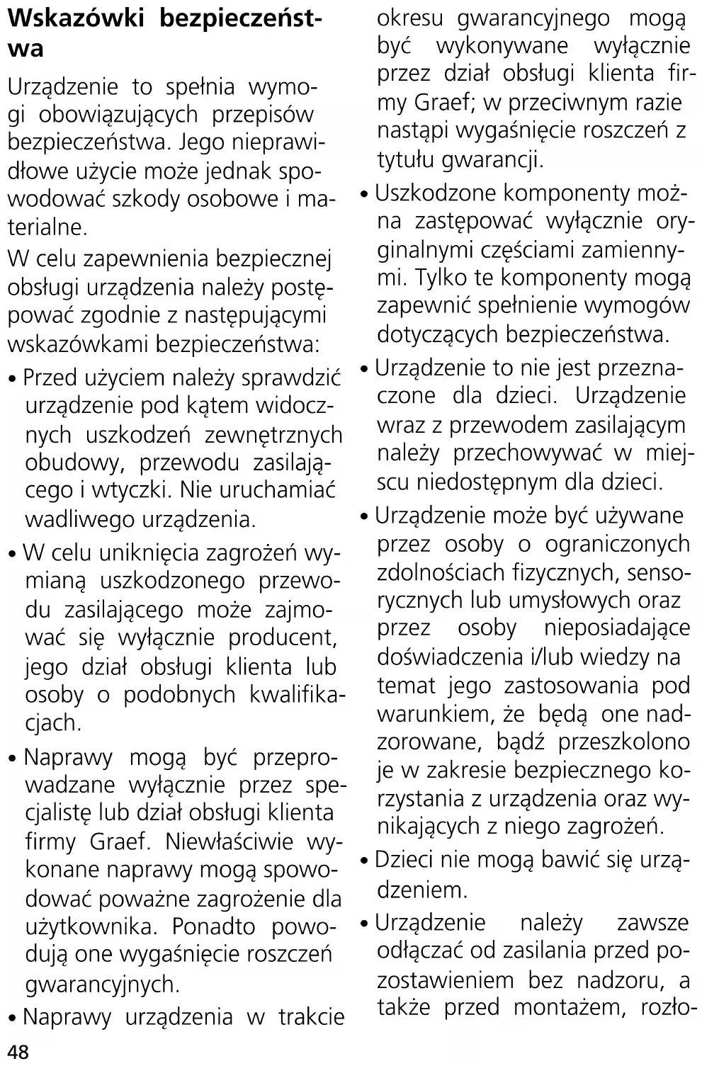 - Naprawy urządzenia w trakcie okresu gwarancyjnego mogą być wykonywane wyłącznie przez dział obsługi klienta r- my Graef; w przeciwnym razie nastąpi wygaśnięcie roszczeń z tytułu gwarancji.