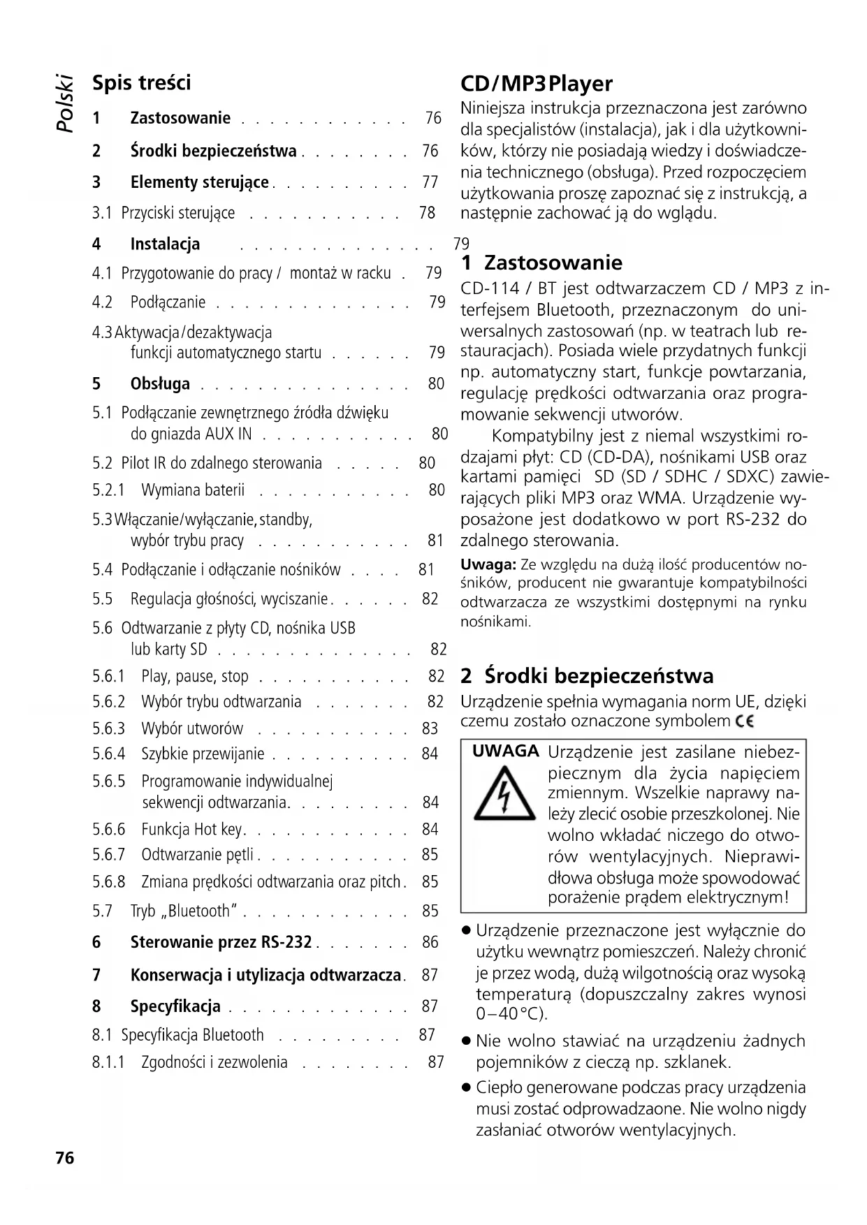 - Memoria USB y tarjeta SD: sólo WMA 9.2 Sujeto a cambios sin previo aviso.76 DeutschDeutsch SeiteInhaltEnglishEnglish PageContentsFrançaisFrançais PageTable des matièresItalianoItaliano PaginaIndiceEspañolEspañol PáginaContenidosNederlandsNederlands PaginaInhoudPolskiPolski StronaSpis treści CD / MP3 Player Niniejsza instrukcja przeznaczona jest zarówno dla specjalistów (instalacja), jak i dla użytkowni- ków, którzy nie posiadają wiedzy i doświadcze- nia technicznego (obsługa). Przed rozpoczęciem użytkowania proszę zapoznać się z instrukcją, a następnie zachować ją do wglądu. 1 Zastosowanie CD-114 / BT jest odtwarzaczem CD / MP3 z in- terfejsem Bluetooth, przeznaczonym do uni- wersalnych zastosowań (np. w teatrach lub re- stauracjach). Posiada wiele przydatnych funkcji np. automatyczny start, funkcje powtarzania, regulację prędkości odtwarzania oraz progra- mowanie sekwencji utworów. Kompatybilny jest z niemal wszystkimi ro- dzajami płyt: CD (CD-DA), nośnikami USB oraz kartami pamięci SD (SD / SDHC / SDXC) zawie- rających pliki MP3 oraz WMA. Urządzenie wy- posażone jest dodatkowo w port RS-232 do zdalnego sterowania. Uwaga: Ze względu na dużą ilość producentów no-śników, producent nie gwarantuje kompatybilności odtwarzacza ze wszystkimi dostępnymi na rynku nośnikami. 2 Środki bezpieczeństwa Urządzenie spełnia wymagania norm UE, dzięki czemu zostało oznaczone symbolem . UWAGA Urządzenie jest zasilane niebez- piecznym dla życia napięciem zmiennym. Wszelkie naprawy na- leży zlecić osobie przeszkolonej. Nie wolno wkładać niczego do otwo- rów wentylacyjnych. Nieprawi- dłowa obsługa może spowodować porażenie prądem elektrycznym!