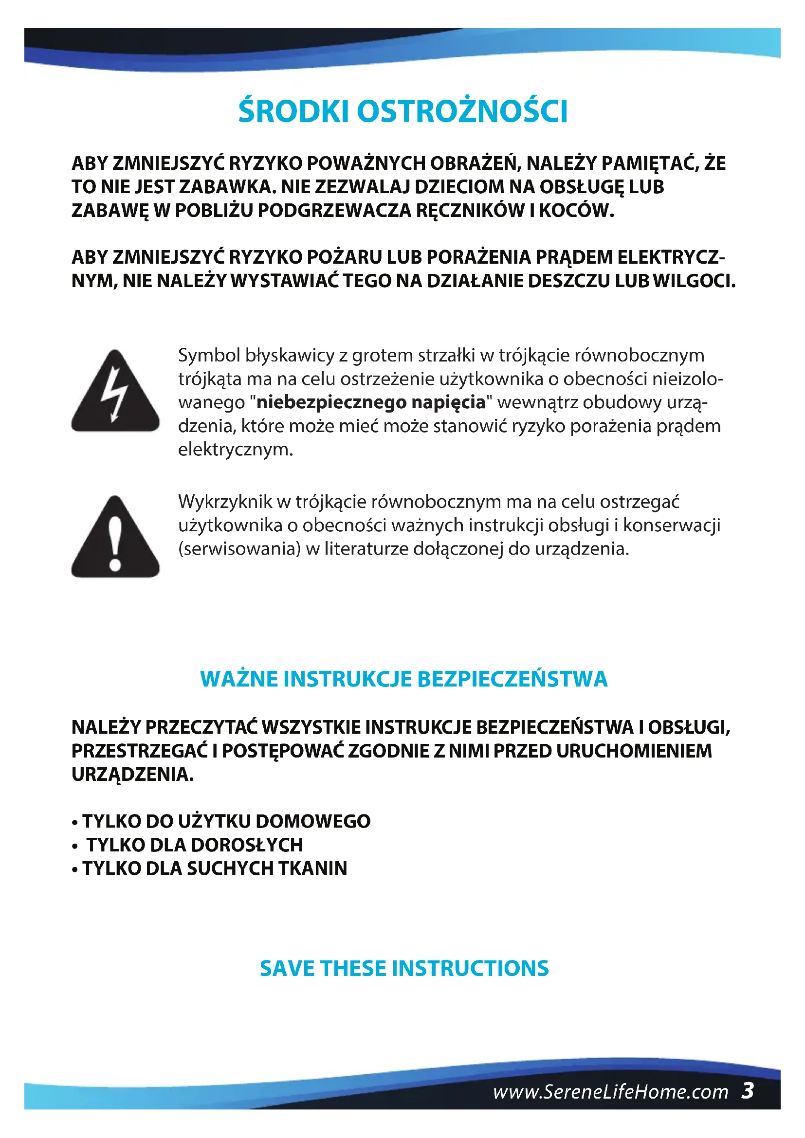zenia, które może mieć może stanowić ryzyko porażenia prądem elektrycznym. Wykrzyknik w trójkącie równobocznym ma na celu ostrzegać użytkownika o obecności ważnych instrukcji obsługi i konserwacji (serwisowania) w literaturze dołączonej do urządzenia.OSTRZEŻENIE OSTRZEŻENIE: ABY ZMNIEJSZYĆ RYZYKO POŻARU, PORAŻENIA PRĄDEM ELEKTRYCZNYM LUB POWAŻNYCH OBRAŻEŃ PODCZAS KORZYSTANIA Z URZĄDZENIA NALEŻY PRZESTRZEGAĆ PODSTAWOWYCH ŚRODKÓW OSTROŻNOŚCI W TYM: www.SereneLifeHome.com4