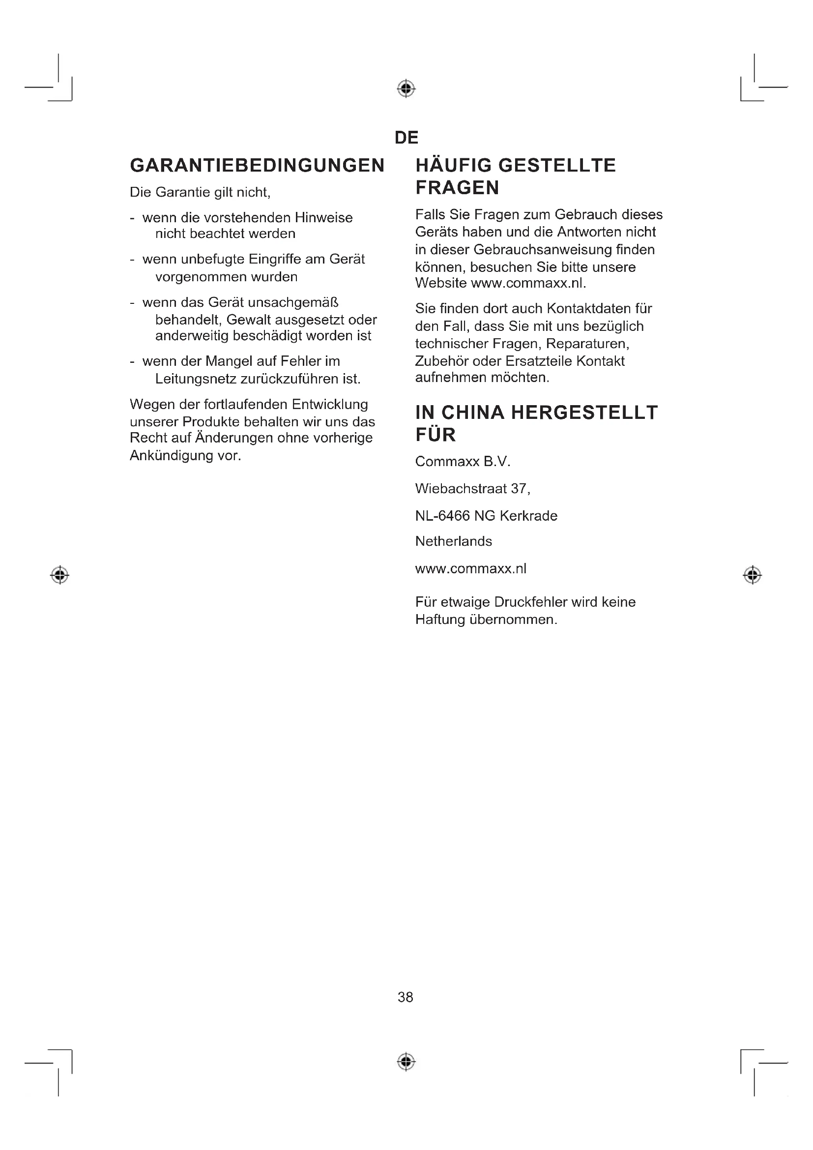 PYTANIA W razie jakichkolwiek pytań dotyczących korzystania z urządzenia niezamieszc- zonych w niniejszej instrukcji należy odwiedzić witrynę www.commaxx.nl. Można znaleźć tam również dane kontak- towe w razie konieczności skonsultowania kwestii technicznych, napraw, spraw związanych z akcesoriami i częściami zamiennymi. WYPRODUKOWANO W CHINACH DLA Commaxx B.V. Wiebachstraat 37, NL-6466 NG Kerkrade Netherlands www.commaxx.nl Firma nie ponosi odpowiedzialności za błędy w druku.