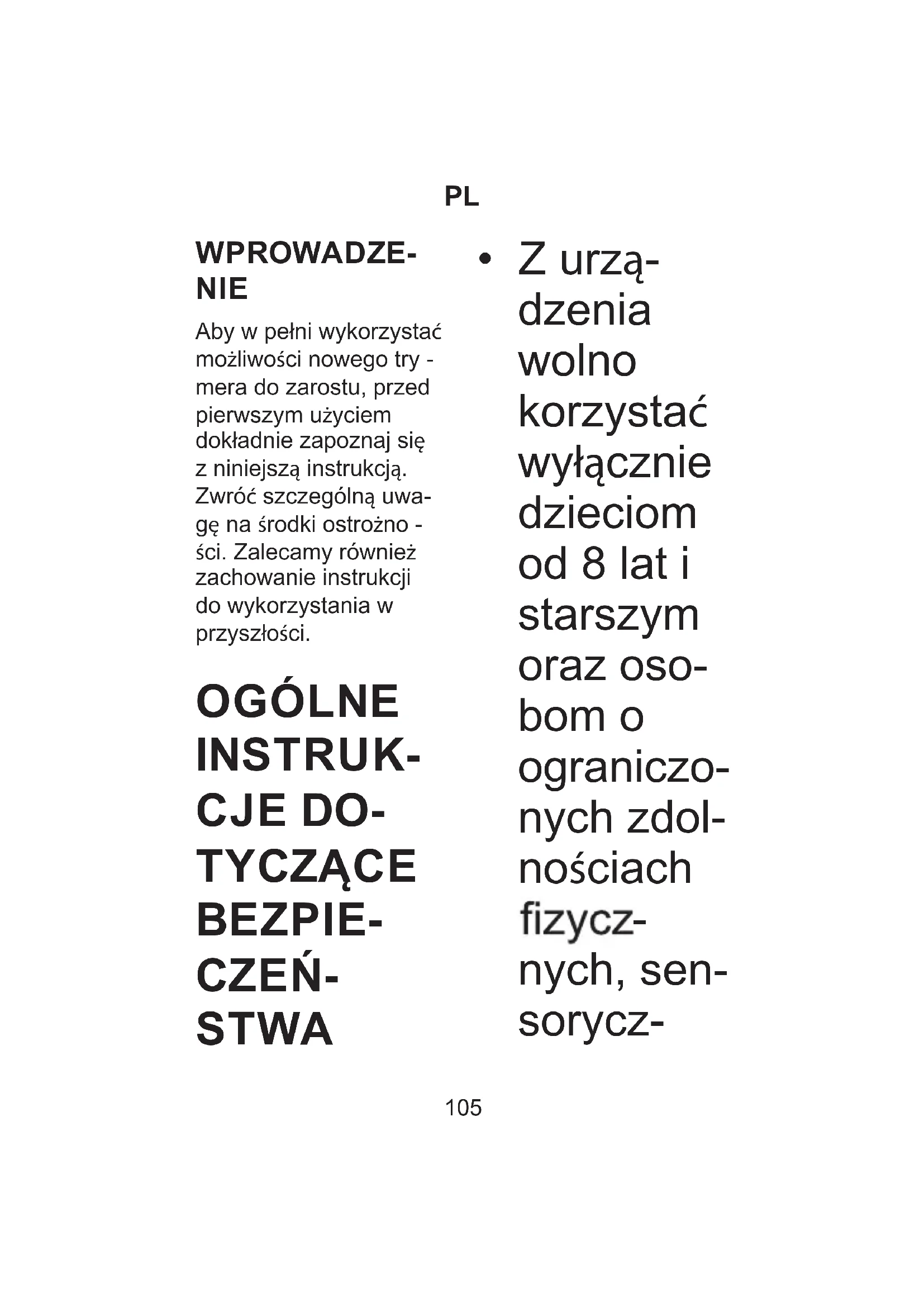 WPROWADZE- NIE Aby w pełni wykorzystać możliwości nowego try - mera do zarostu, przed pierwszym użyciem dokładnie zapoznaj się z niniejszą instrukcją. Zwróć szczególną uwa- gę na środki ostrożno - ści. Zalecamy również zachowanie instrukcji do wykorzystania w przyszłości. OGÓLNE INSTRUK- CJE DO- TYCZĄCE BEZPIE- CZEŃ- STWA