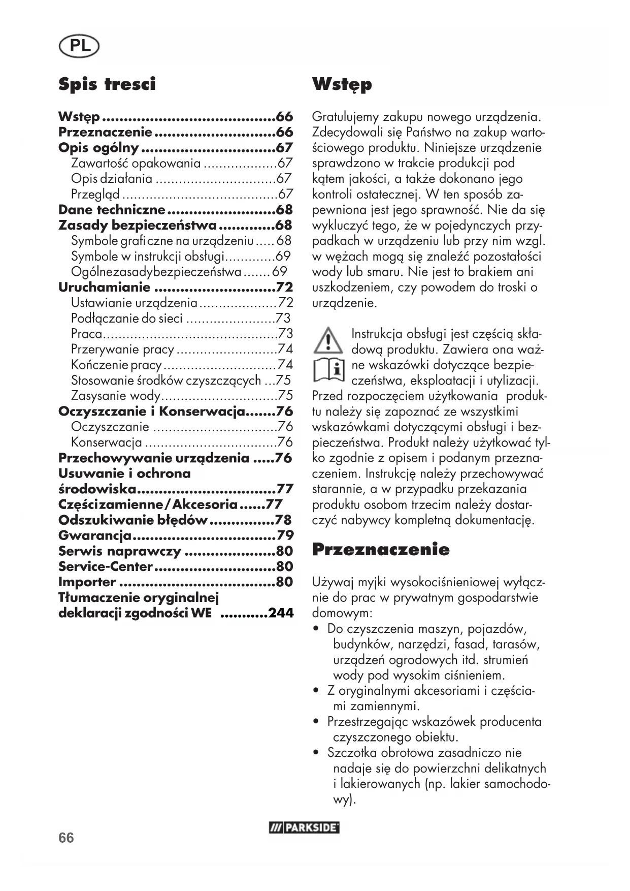 - Szczotka obrotowa zasadniczo nie nadaje się do powierzchni delikatnych i lakierowanych (np. lakier samochodo- wy). Spis tresci Wstęp ........................................66 Przeznaczenie ............................66 Opis ogólny ...............................67 Zawartość opakowania ...................67 Opis działania ...............................67 Przegląd ........................................67 Dane techniczne .........................68 Zasady bezpieczeństwa .............68 Symbole gra czne na urządzeniu ..... 68 Symbole w instrukcji obsługi .............69 Ogólne zasady bezpieczeństwa ....... 69 Uruchamianie ............................72 Ustawianie urządzenia .................... 72 Podłączanie do sieci .......................73 Praca .............................................73 Przerywanie pracy ..........................74 Kończenie pracy ............................. 74 Stosowanie środków czyszczących ...75 Zasysanie wody ..............................75 Oczyszczanie i Konserwacja .......76 Oczyszczanie ................................76 Konserwacja ..................................76 Przechowywanie urządzenia .....76 Usuwanie i ochrona środowiska ................................ 77 Części zamienne / Akcesoria ......77 Odszukiwanie błędów ...............78 Gwarancja ................................. 79 Serwis naprawczy .....................80 Service-Center ............................80 Importer ....................................80 Tłumaczenie oryginalnej deklaracji zgodności WE