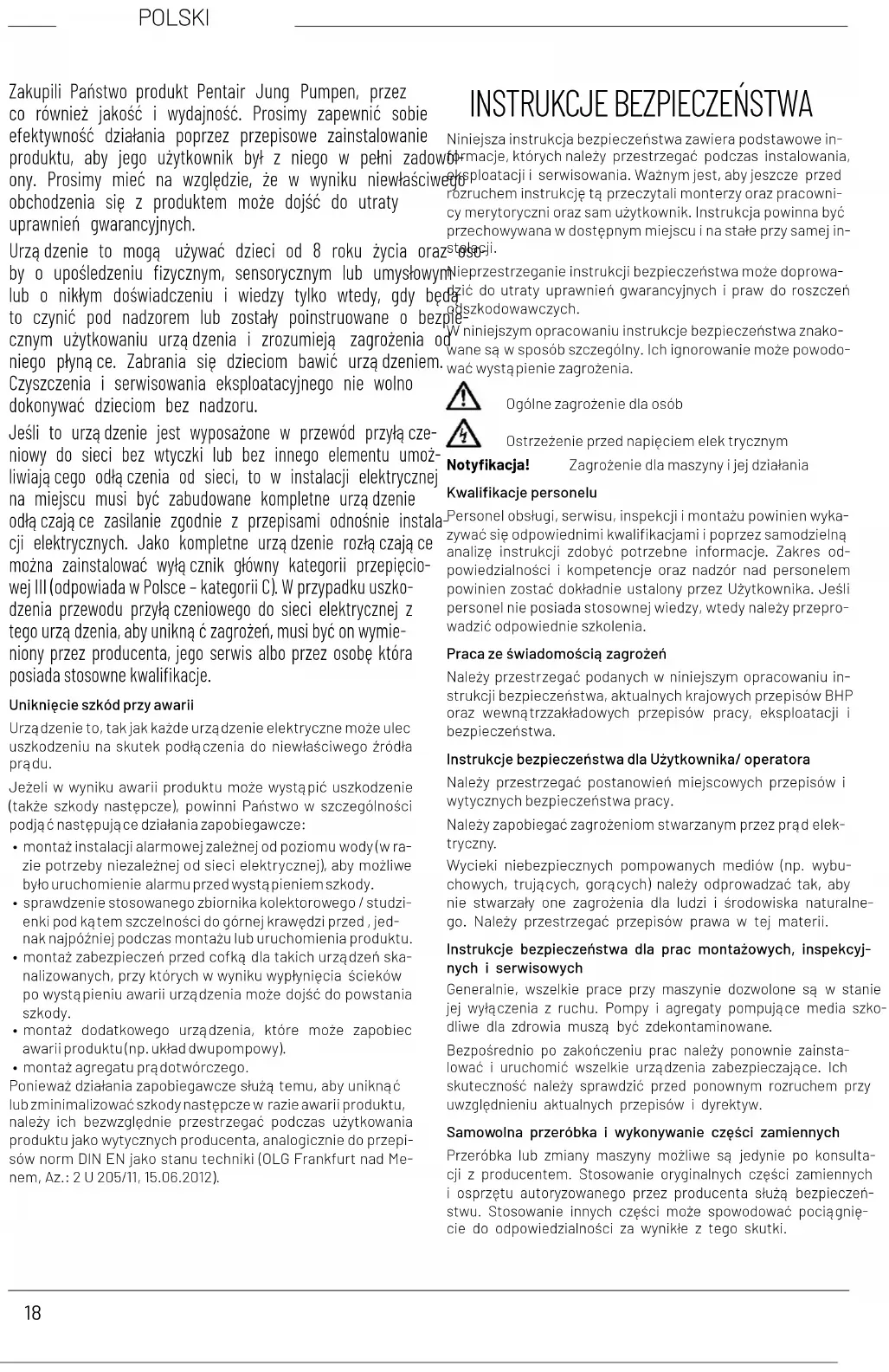 - Errata direzione di rotazione per corrente trifase = far sosti- tuire 2 fasi della linea di alimentazione ad opera di un elettri- cista esperto18 POLSKI Zakupili Państwo produkt Pentair Jung Pumpen, przez co również jakość i wydajność. Prosimy zapewnić sobie efektywność działania poprzez przepisowe zainstalowanie produktu, aby jego użytkownik był z niego w pełni zadowol- ony. Prosimy mieć na względzie, że w wyniku niewłaściwego obchodzenia się z produktem może dojść do utraty uprawnień gwarancyjnych. Urządzenie to mogą używać dzieci od 8 roku życia oraz oso- by o upośledzeniu zycznym, sensorycznym lub umysłowym lub o nikłym doświadczeniu i wiedzy tylko wtedy, gdy będą to czynić pod nadzorem lub zostały poinstruowane o bezpie- cznym użytkowaniu urządzenia i zrozumieją zagrożenia od niego płynące. Zabrania się dzieciom bawić urządzeniem. Czyszczenia i serwisowania eksploatacyjnego nie wolno dokonywać dzieciom bez nadzoru. Jeśli to urządzenie jest wyposażone w przewód przyłącze- niowy do sieci bez wtyczki lub bez innego elementu umoż- liwiającego odłączenia od sieci, to w instalacji elektrycznej na miejscu musi być zabudowane kompletne urządzenie odłączające zasilanie zgodnie z przepisami odnośnie instala- cji elektrycznych. Jako kompletne urządzenie rozłączające można zainstalować wyłącznik główny kategorii przepięcio- wej III (odpowiada w Polsce – kategorii C). W przypadku uszko- dzenia przewodu przyłączeniowego do sieci elektrycznej z tego urządzenia, aby uniknąć zagrożeń, musi być on wymie- niony przez producenta, jego serwis albo przez osobę która posiada stosowne kwalikacje. Uniknięcie szkód przy awarii Urządzenie to, tak jak każde urządzenie elektryczne może ulec uszkodzeniu na skutek podłączenia do niewłaściwego źródła prądu. Jeżeli w wyniku awarii produktu może wystąpić uszkodzenie (także szkody następcze), powinni Państwo w szczególności podjąć następujące działania zapobiegawcze: