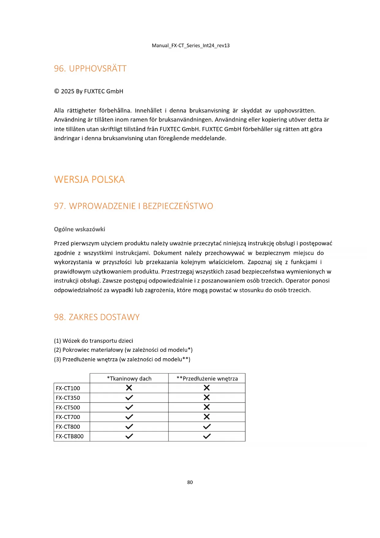 Krótkie i długie maty (dostępne dla wszystkich modeli CT500 i CT700) Przezroczysta osłona przeciwdeszczowa (dostępna dla modeli CT500, CT700 + CT800) Osłona przeciwsłoneczna i moskitiera (dostępne dla modeli CT500, CT700 + CT800) Pasy bezpieczeństwa w różnych kolorach (dostępne dla wszystkich modeli) Torby termiczne w różnych kolorach (dostępne dla wszystkich modeli)Manual_FX-CT_Series_Int24_rev13