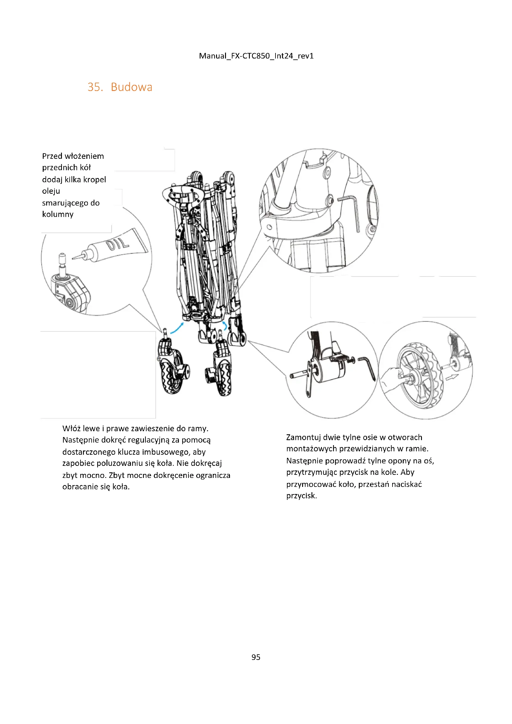 Przed włożeniem przednich kół dodaj kilka kropel oleju smarującego do kolumny przedniego koła. Zamontuj dwie tylne osie w otworach montażowych przewidzianych w ramie. Następnie poprowadź tylne opony na oś, przytrzymując przycisk na kole. Aby przymocować koło, przestań naciskać przycisk. Włóż lewe i prawe zawieszenie do ramy. Następnie dokręć regulacyjną za pomocą dostarczonego klucza imbusowego, aby zapobiec poluzowaniu się koła. Nie dokręcaj zbyt mocno. Zbyt mocne dokręcenie ogranicza obracanie się koła.Manual_FX-CTC850_Int24_rev1