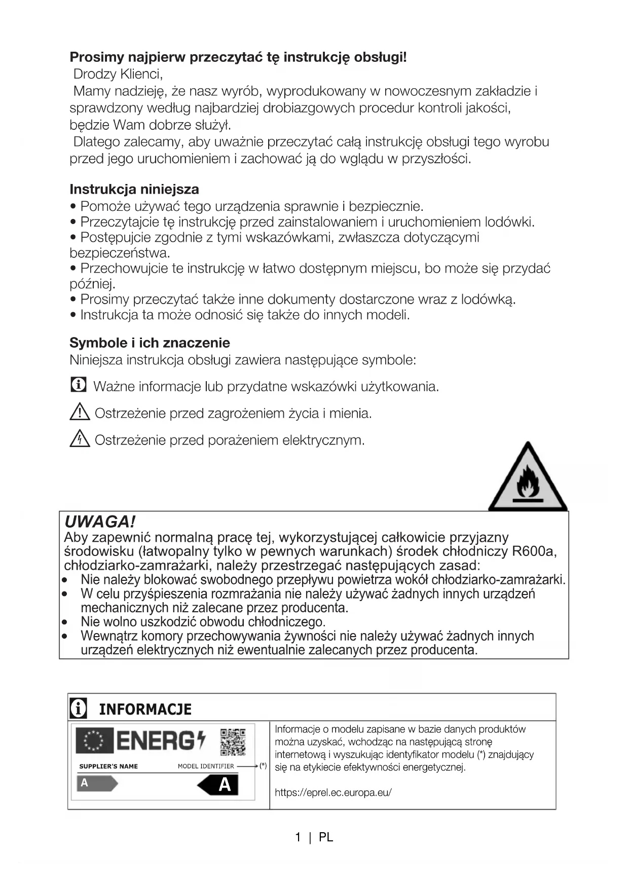 Ostrzeżenie przed porażeniem elektrycznym. UWAGA! Aby zapewnić normalną pracę tej, wykorzystującej całkowicie przyjazny środowisku (łatwopalny tylko w pewnych warunkach) środek chłodniczy R600a, chłodziarko-zamrażarki, należy przestrzegać następujących zasad: Nie należy blokować swobodnego przepływu powietrza wokół chłodziarko-zamrażarki. W celu przyśpieszenia rozmrażania nie należy używać żadnych innych urządzeńmechanicznych niż zalecane przez producenta. Nie wolno uszkodzić obwodu chłodniczego. Wewnątrz komory przechowywania żywności nie należy używać żadnych innychurządzeń elektrycznych niż ewentualnie zalecanych przez producenta.