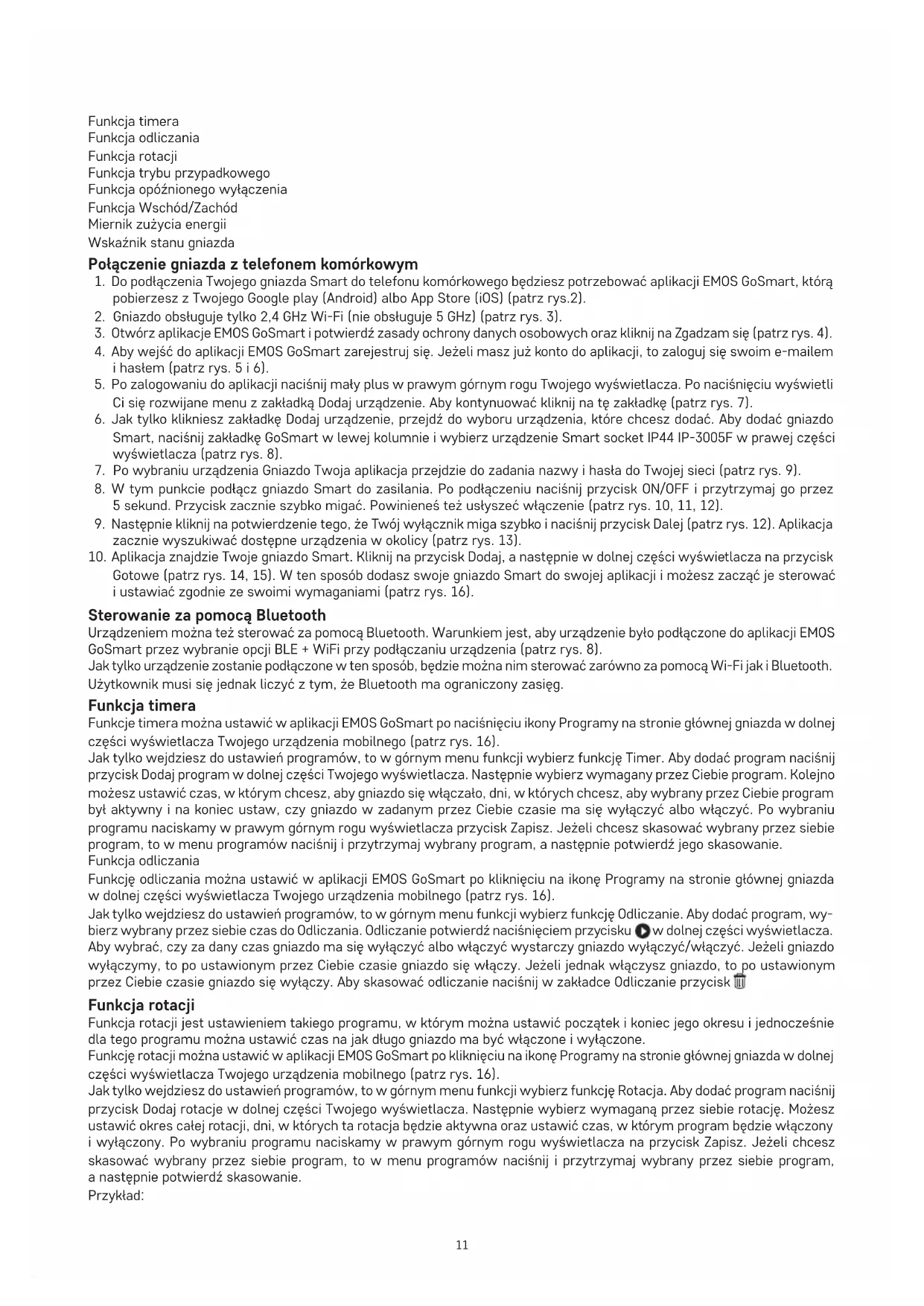 5sekund. Przycisk zacznie szybko migać. Powinieneś też usłyszeć włączenie (patrz rys. 10, 11, 12). 9. Następnie kliknij na potwierdzenie tego, że Twój wyłącznik miga szybko i naciśnij przycisk Dalej (patrz rys. 12). Aplikacja zacznie wyszukiwać dostępne urządzenia wokolicy (patrz rys. 13). 10. Aplikacja znajdzie Twoje gniazdo Smart. Kliknij na przycisk Dodaj, a następnie w dolnej części wyświetlacza na przycisk Gotowe (patrz rys. 14, 15). W ten sposób dodasz swoje gniazdo Smart do swojej aplikacji i możesz zacząć je sterować i ustawiać zgodnie ze swoimi wymaganiami (patrz rys. 16). Sterowanie za pomocą Bluetooth Urządzeniem można też sterować za pomocą Bluetooth. Warunkiem jest, aby urządzenie było podłączone do aplikacji EMOS GoSmart przez wybranie opcji BLE + WiFi przy podłączaniu urządzenia (patrz rys. 8). Jak tylko urządzenie zostanie podłączone w ten sposób, będzie można nim sterować zarówno za pomocą Wi-Fi jak i Bluetooth. Użytkownik musi się jednak liczyć z tym, że Bluetooth ma ograniczony zasięg. Funkcja timera Funkcje timera można ustawić w aplikacji EMOS GoSmart po naciśnięciu ikony Programy na stronie głównej gniazda w dolnej części wyświetlacza Twojego urządzenia mobilnego (patrz rys. 16). Jak tylko wejdziesz do ustawień programów, to w górnym menu funkcji wybierz funkcję Timer. Aby dodać program naciśnij przycisk Dodaj program w dolnej części Twojego wyświetlacza. Następnie wybierz wymagany przez Ciebie program. Kolejno możesz ustawić czas, w którym chcesz, aby gniazdo się włączało, dni, w których chcesz, aby wybrany przez Ciebie program był aktywny i na koniec ustaw, czy gniazdo w zadanym przez Ciebie czasie ma się wyłączyć albo włączyć. Po wybraniu programu naciskamy w prawym górnym rogu wyświetlacza przycisk Zapisz. Jeżeli chcesz skasować wybrany przez siebie program, to w menu programów naciśnij i przytrzymaj wybrany program, a następnie potwierdź jego skasowanie. Funkcja odliczania Funkcję odliczania można ustawić w aplikacji EMOS GoSmart po kliknięciu na ikonę Programy na stronie głównej gniazda wdolnej części wyświetlacza Twojego urządzenia mobilnego (patrz rys. 16). Jak tylko wejdziesz do ustawień programów, to w górnym menu funkcji wybierz funkcję Odliczanie. Aby dodać program, wy- bierz wybrany przez siebie czas do Odliczania. Odliczanie potwierdź naciśnięciem przycisku w dolnej części wyświetlacza. Aby wybrać, czy za dany czas gniazdo ma się wyłączyć albo włączyć wystarczy gniazdo wyłączyć/włączyć. Jeżeli gniazdo wyłączymy, to po ustawionym przez Ciebie czasie gniazdo się włączy. Jeżeli jednak włączysz gniazdo, to po ustawionym przez Ciebie czasie gniazdo się wyłączy. Aby skasować odliczanie naciśnij w zakładce Odliczanie przycisk . Funkcja rotacji Funkcja rotacji jest ustawieniem takiego programu, w którym można ustawić początek i koniec jego okresu i jednocześnie dla tego programu można ustawić czas na jak długo gniazdo ma być włączone i wyłączone. Funkcję rotacji można ustawić w aplikacji EMOS GoSmart po kliknięciu na ikonę Programy na stronie głównej gniazda wdolnej części wyświetlacza Twojego urządzenia mobilnego (patrz rys. 16). Jak tylko wejdziesz do ustawień programów, to w górnym menu funkcji wybierz funkcję Rotacja. Aby dodać program naciśnij przycisk Dodaj rotacje w dolnej części Twojego wyświetlacza. Następnie wybierz wymaganą przez siebie rotację. Możesz ustawić okres całej rotacji, dni, w których ta rotacja będzie aktywna oraz ustawić czas, w którym program będzie włączony i wyłączony. Po wybraniu programu naciskamy w prawym górnym rogu wyświetlacza na przycisk Zapisz. Jeżeli chcesz skasować wybrany przez siebie program, to w menu programów naciśnij i przytrzymaj wybrany przez siebie program, anastępnie potwierdź skasowanie. Przykład:12 Ustawiamy rotację w okresie 6:00–8:00. Czas włączenia ustawiamy na 30 minut, a czas wyłączenia na 15 minut. Gniazdo będzie włączone w czasie 6:00–6:30 -> Wyłączone wczasie 6:30–6:45 -> Włączone w czasie 6:45–7:15 -> Wy- łączone w czasie 7:15–7:30 -> Włączone w czasie 7:30–8:00 -> Potem kończy się cały czas rotacji i gniazdo wyłączy się. Funkcja trybu przypadkowego Funkcje trybu przypadkowego można ustawić w aplikacji EMOS GoSmart po kliknięciu ikony Programy na stronie głównej gniazda w dolnej części wyświetlacza Twojego urządzenia mobilnego (patrz rys. 16). Jak tylko wejdziesz do ustawień programów, to w górnym menu funkcji wybierz funkcję Tryb przypadkowy. Aby dodać program naciśnij przycisk Dodaj tryb przypadkowy w dolnej części Twojego wyświetlacza. Można ustawić okres całego Trybu przypadkowego i dni, w których Twój Tryb przypadkowy będzie aktywny. Po wybraniu programu naciskamy w prawym górnym rogu wyświetlacza na przycisk Zapisz. Jeżeli chcesz skasować wybrany przez siebie program, to w menu programów naciśnij i przytrzymaj wybrany przez siebie program, a następnie potwierdź skasowanie. Po ustawieniu tej funkcji gniazdo znajdzie się w trybie przypadkowym, dzięki któremu Twoje gniazdo będzie się włączać i wyłączać przypadkowo. Dla okresów czasu, które są dłuższe albo równe 1 godzinie obowiązuje to, że gniazdo włączy się w czasie 2–30 minut od początku ustawionego okresu i wyłączy na 2–30 przed zakończeniem ustawionego okresu czasu. Przykład: Jeżeli ustawimy tryb na okres od 8:00 do 10:00, to gniazdo włączy się w czasie od 8:02–8:30, a wyłączy w czasie 9:30–9:58. Dla okresów, które są krótsze od 1 godziny obowiązuje to, że gniazdo włączy się w czasie 2–X minut i wyłączy znowu w czasie 2–X. Wartość X wynika z długości ustawionego okresu całej funkcji. X = (Długość okresu/2) - 2. Przykład: Jeżeli ustawimy tryb na okres 8:00–8:30, to Wasze urządzenie włączy się w czasie 8:02–8: