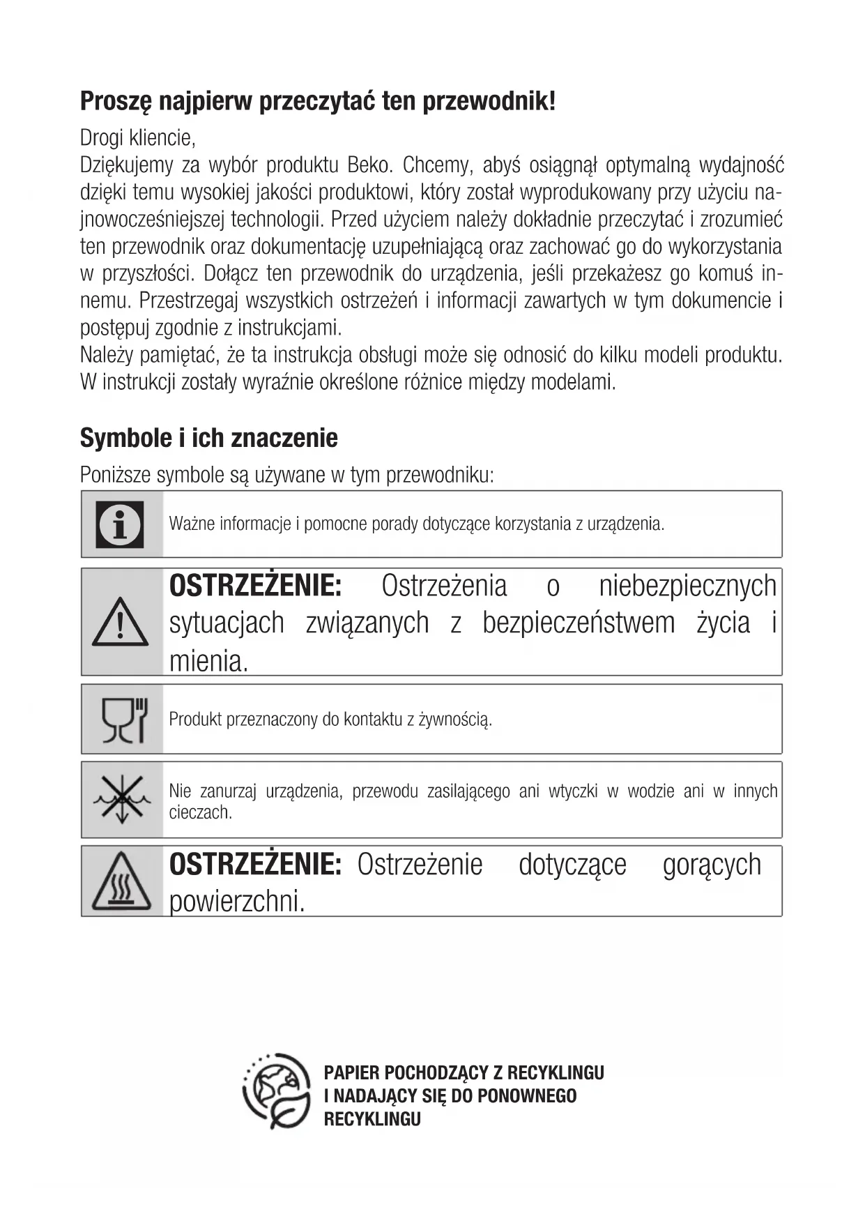 OSTRZEŻENIE: Ostrzeżenia o niebezpiecznych sytuacjach związanych z bezpieczeństwem życia i mienia. Produkt przeznaczony do kontaktu z żywnością.Nie zanurzaj urządzenia, przewodu zasilającego ani wtyczki w wodzie ani w innych cieczach. OSTRZEŻENIE: Ostrzeżenie dotyczące gorących powierzchni. PAPIER POCHODZĄCY Z RECYKLINGUI NADAJĄCY SIĘ DO PONOWNEGO RECYKLINGU55/PL Frytownica na gorące powietrze/Instrukcja obsługi 1 Ważne instrukcje dotyczące bezpieczeństwa i ochrony środowiska Ta sekcja zawiera instrukcje bezpiec- zeństwa, aby zapobiec zagrożeniom, które mogą spowodować obrażenia ciała lub uszkodzenie mienia. Nieprzestrzeganie tych instrukcji unie- ważnia wszystkie gwarancje.