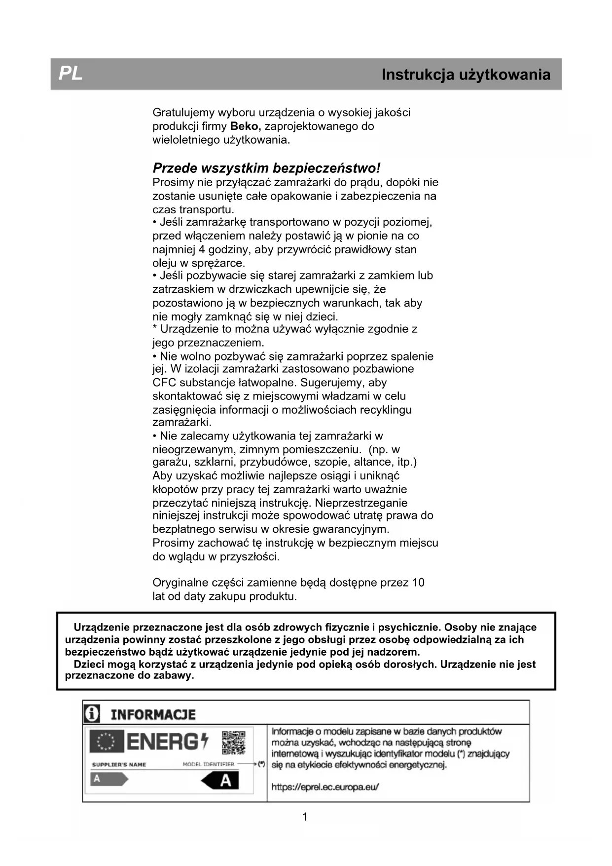 29Gratulujemy wyboru urządzenia o wysokiej jakości produkcji firmy Beko, zaprojektowanego do wieloletniego użytkowania. Przede wszystkim bezpieczeństwo! Prosimy nie przyłączać zamrażarki do prądu, dopóki nie zostanie usunięte całe opakowanie i zabezpieczenia na czas transportu.