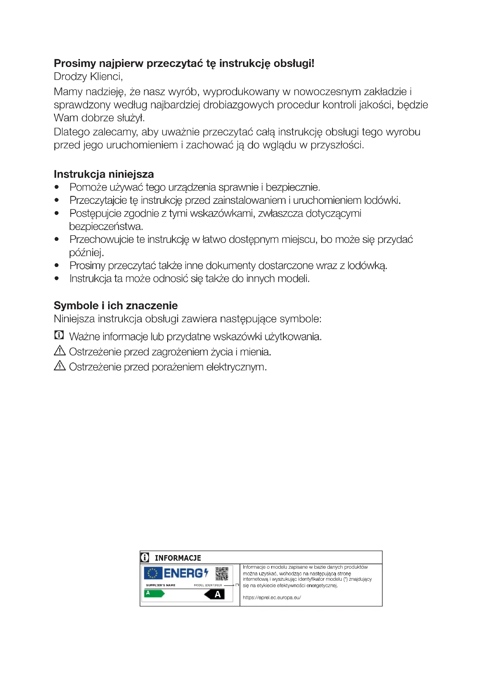 Razpoložljivost rezervnih delov hladilnik, ki ste ga kupili, je 10 let. V tem obdobju bodo na voljo originalni nadomestni deli za pravilno delovanje hladilnik. Hladilnik, ki ste ga kupili, ima najmanj 24-mesečno garancijo. Ta izdelek je opremljen z svetlobnim virom energijskega razreda “G”. Svetlobni vir v tem izdelku lahko zamenjajo samo poklicni serviserji.Prosimy najpierw przeczytać tę instrukcję obsługi! Drodzy Klienci, Mamy nadzieję, że nasz wyrób, wyprodukowany w nowoczesnym zakładzie i sprawdzony według najbardziej drobiazgowych procedur kontroli jakości, będzie Wam dobrze służył. Dlatego zalecamy, aby uważnie przeczytać całą instrukcję obsługi tego wyrobu przed jego uruchomieniem i zachować ją do wglądu w przyszłości. Instrukcja niniejsza