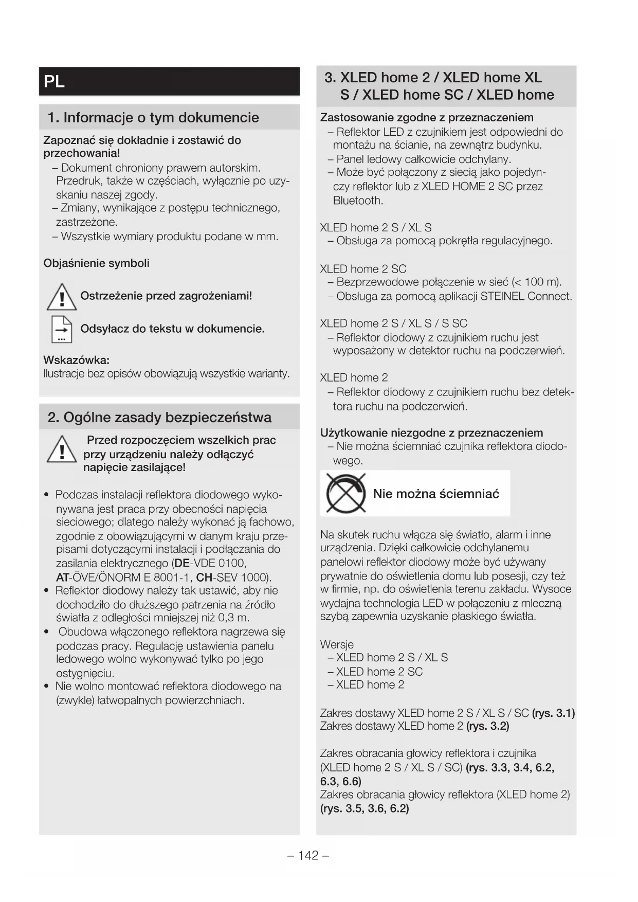 S/XLEDhome SC/XLEDhome Zastosowanie zgodne zprzeznaczeniem – Reflektor LED z czujnikiem jest odpowiedni do montażu na ścianie, na zewnątrz budynku. – Panel ledowy całkowicie odchylany. – Może być połączony z siecią jako pojedyn- czy reflektor lub z XLED HOME 2 SC przez Bluetooth. XLEDhome2 S/XL S – Obsługa za pomocą pokrętła regulacyjnego. XLEDhome2 SC – Bezprzewodowe połączenie w sieć (< 100m). – Obsługa za pomocą aplikacji STEINEL Connect. XLED home 2 S/XL S/S SC – Reflektor diodowy z czujnikiem ruchu jest wyposażony w detektor ruchu na podczerwień. XLED home 2 – Reflektor diodowy z czujnikiem ruchu bez detek- tora ruchu na podczerwień. Użytkowanie niezgodne z przeznaczeniem – Nie można ściemniać czujnika reflektora diodo- wego. Nie można ściemniać Na skutek ruchu włącza się światło, alarm iinne urządzenia. Dzięki całkowicie odchylanemu panelowi reflektor diodowy może być używany prywatnie do oświetlenia domu lub posesji, czy też wfirmie, np. do oświetlenia terenu zakładu. Wysoce wydajna technologia LED w połączeniu z mleczną szybą zapewnia uzyskanie płaskiego światła. Wersje – XLEDhome2 S/XL S – XLEDhome2SC – XLEDhome2 Zakres dostawy XLED home 2 S/XL S/SC (rys.3.1) Zakres dostawy XLEDhome2 (rys.3.2) Zakres obracania głowicy reflektora i czujnika (XLED home 2 S/XL S/SC) (rys.3.3, 3.4, 6.2, 6.3, 6.6) Zakres obracania głowicy reflektora (XLEDhome2) (rys.3.5, 3.6, 6.2)– 143 – Wymiary produktu (XLED home 2 S/XL S/SC) (rys.3.7, 3.8) Wymiary produktu (XLEDhome2) (rys.3.9, 3.10) Przegląd urządzenia (XLED home 2 S/XL S/SC) (rys.3.11) A Panel LED B Obudowa C Uchwyt naścienny D Moduł czujnika E Ustawienie czasu (XLED home 2 S/XLED home2XL S) F Ustawianie progu czułości zmierzchowej (XLED home 2 S/XLEDhome 2 XL S) Przegląd urządzenia (XLEDhome2) (rys.3.12) A Panel LED B Obudowa C Uchwyt naścienny Rozkład natężenia światła (rys. 3.13)